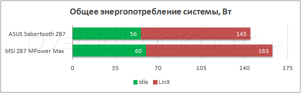 В любом режиме работы ASUS Sabertooth Z87 продемонстрировала образцовую энергоэффективность, оказавшись существенно экономичнее соперницы — MSI Z87 MPower Max.