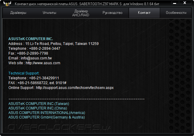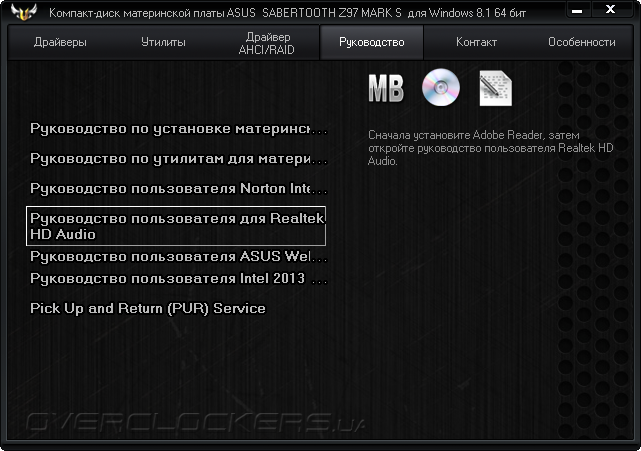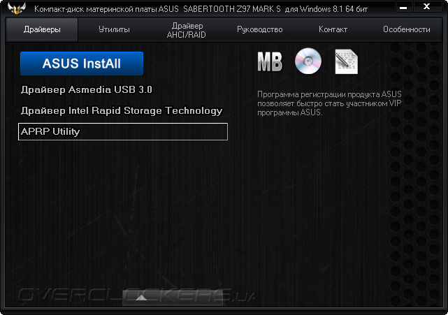 При работе с комплектным диском оказываешься в меню, стиль оформления которого свойственен традиционным тёмным оттенкам серии TUF. Разделы по установке драйверов и утилит обладают мастерами установок, но в них включены не все продукты, доступные для обозрения из главного окна.