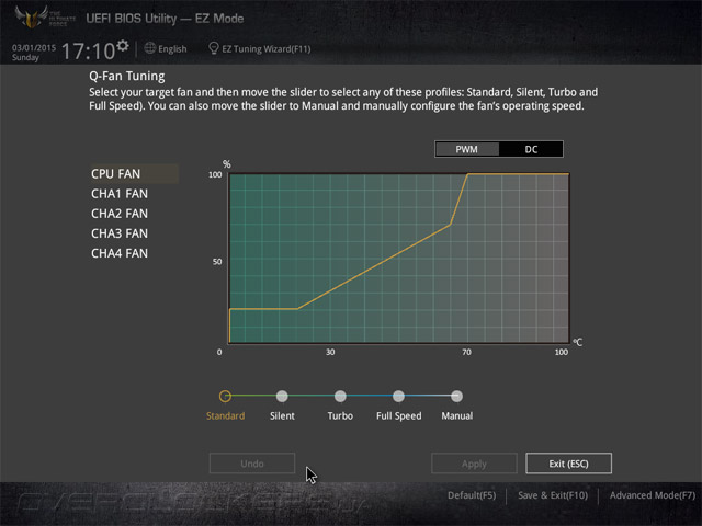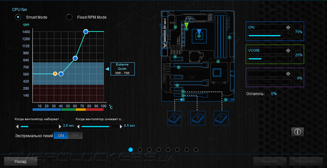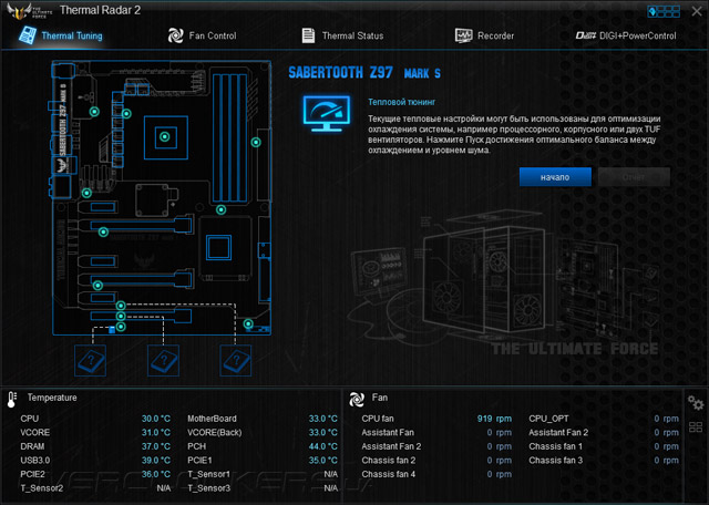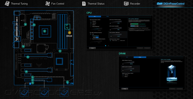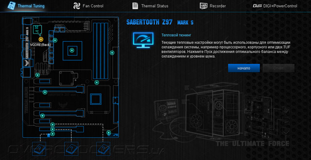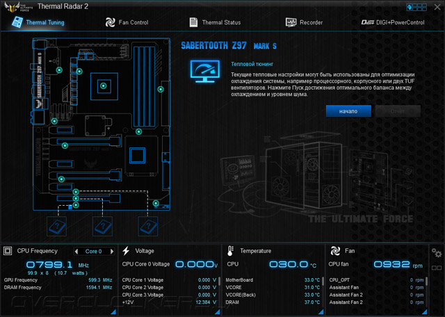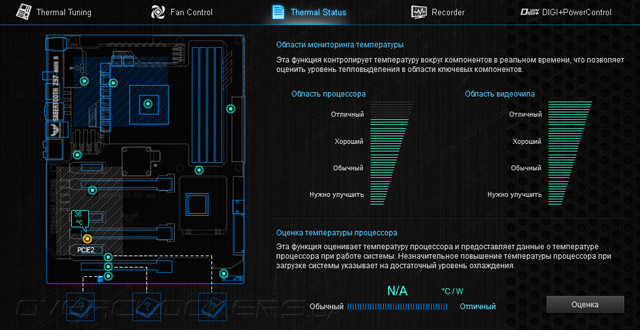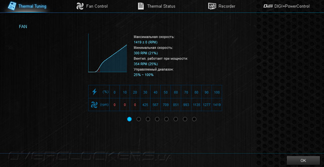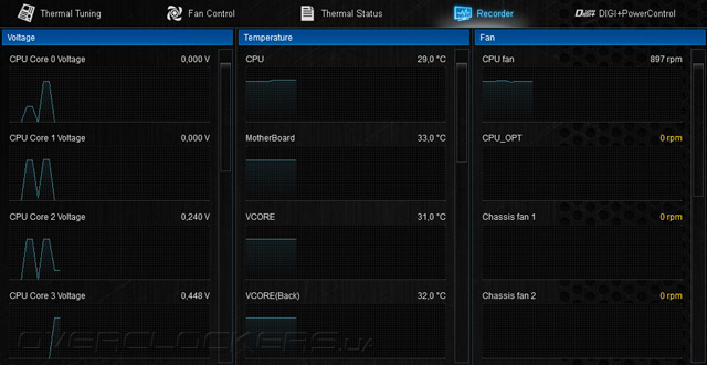 Всего страниц пять. Второй по порядку и значимости идёт Fan Control, где можно позже внести изменения, либо самостоятельно окунуться в настройки без помощи мастера. На следующей, имеющей название Thermal Status, находится своеобразный бенчмарк, выполняющий анализ успешности внесённых правок в схему работы охладителей. Замыкает ряд Recorder, где не сильно наглядно фиксируются во времени значения действующих напряжений, и DIGI+PowerControl. Последняя вкладка отображает текущие настройки подсистем стабилизации питания ЦП и ОЗУ.