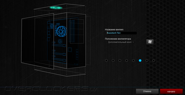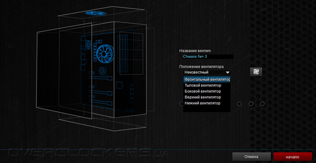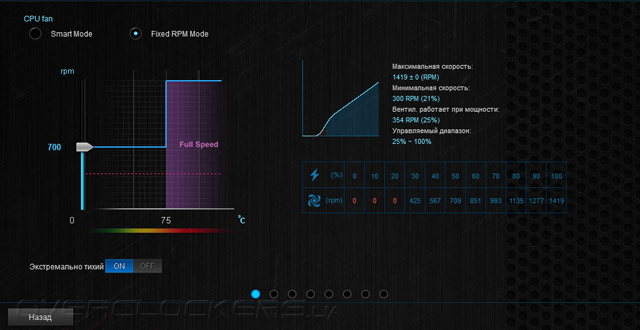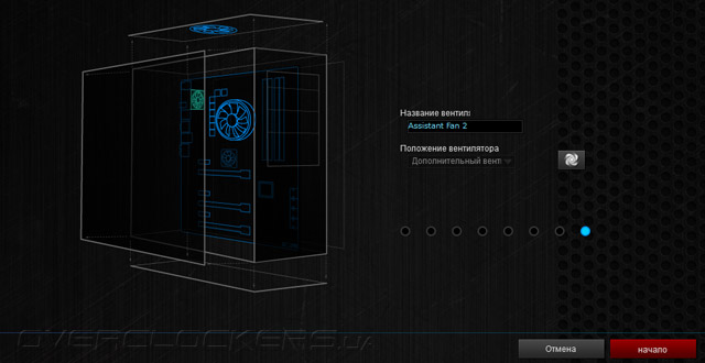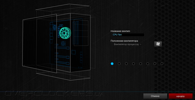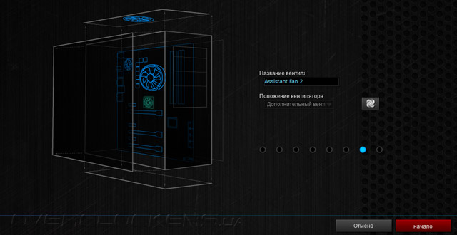 Мастер по настройке позволит задать удобное имя для отдельного охладителя, выбрать для него определённое местоположение на схематическом изображении системного блока. Всё это облегчит дальнейшую работу с программным комплексом. После процедуры калибровки будет отображён паспорт для каждого изделия. Затем можно откорректировать поведение охладителя при росте температуры. При этом учитываться может не только показатель температуры ЦП, а всё обилие датчиков, распаянных или подключенных извне, три штуки идут в комплекте с платой. Влиять на скорость вращения могут три независимых температурных показателя с установкой степени влияния каждого из них. Для упрощённой настройки можно зафиксировать обороты на единой отметке до момента роста температуры ЦП до 75 °C, когда автоматически обороты выйдут на свой максимальный уровень.