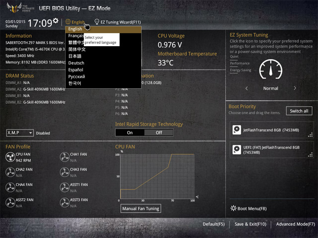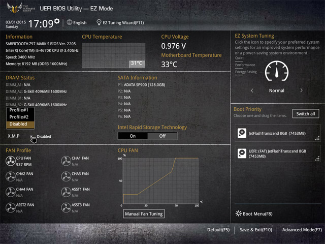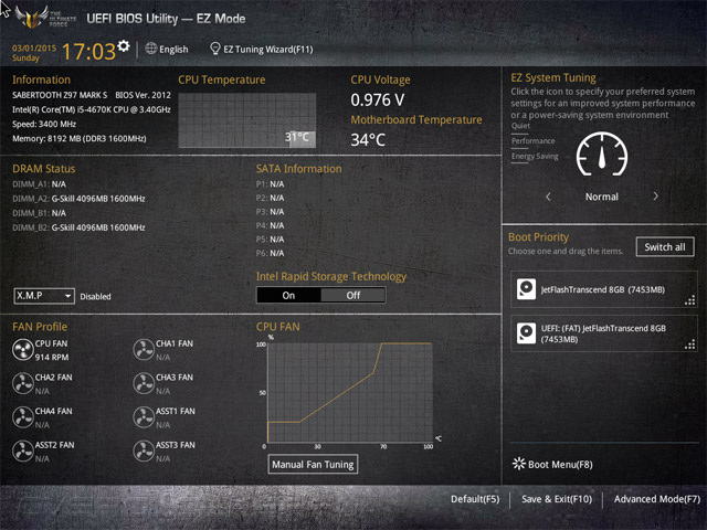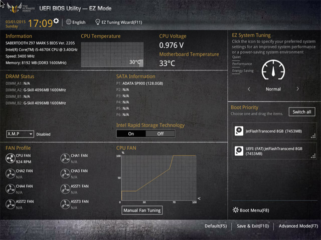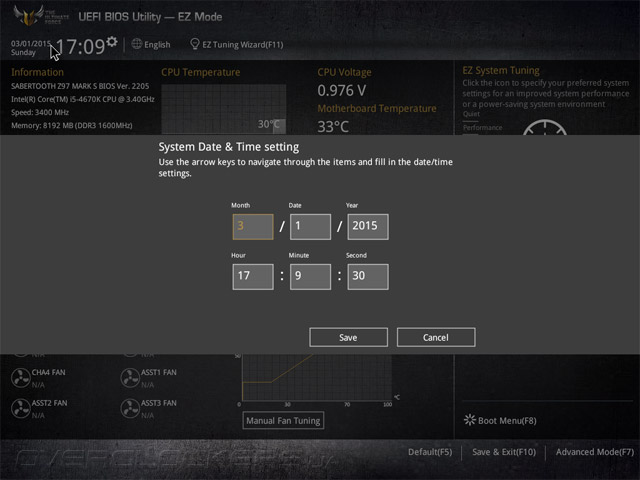 Sabertooth Z97 Mark S оснащён полнофункциональным UEFI, позволяющим не только осуществить базовую настройку системы, но и произвести разгон, а также справится с обилием вентиляторных гнёзд. Отыскать что-либо необычное, свойственное лимитированному изданию, не получилось, но и без того возможности весьма богаты.