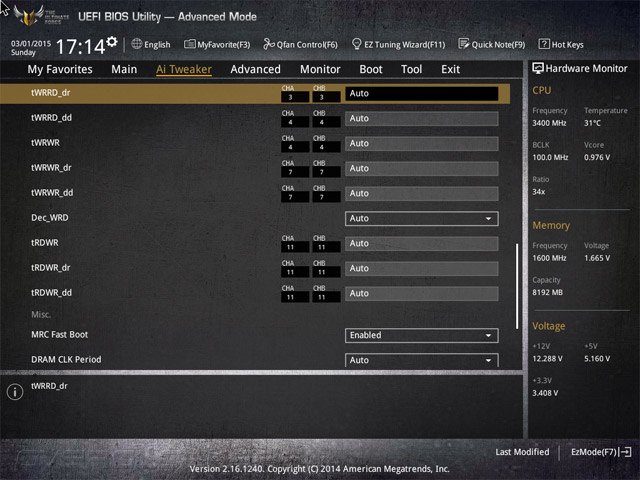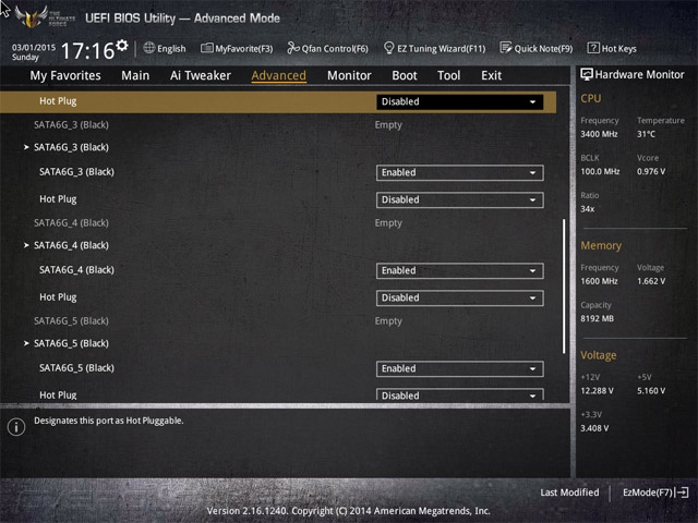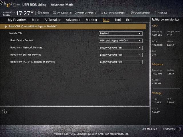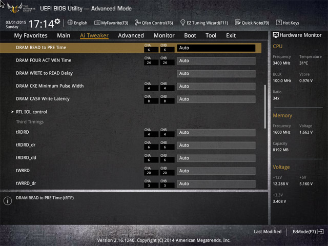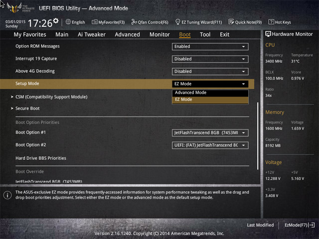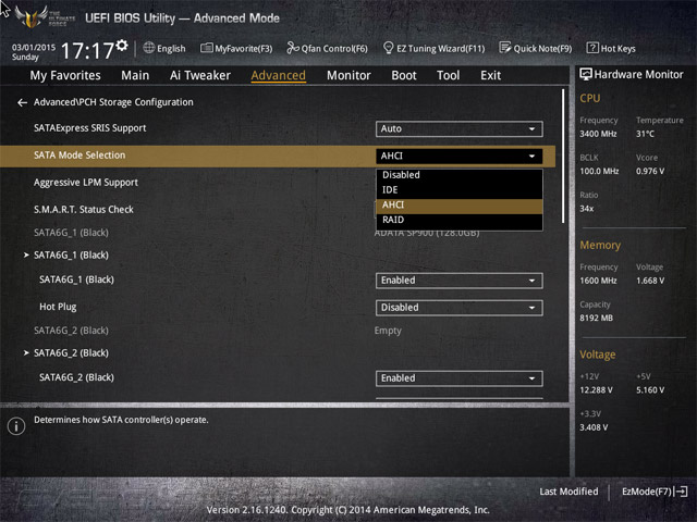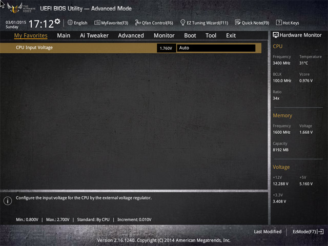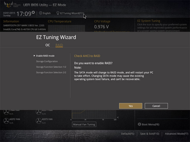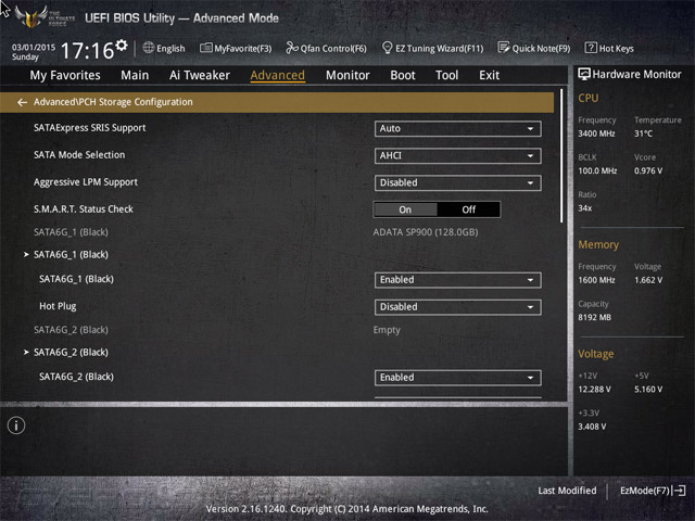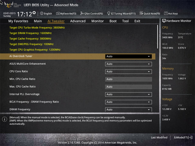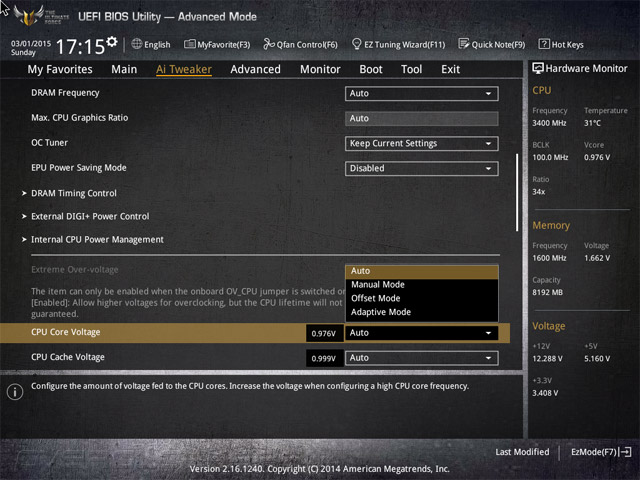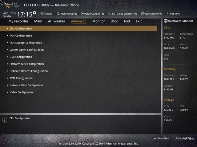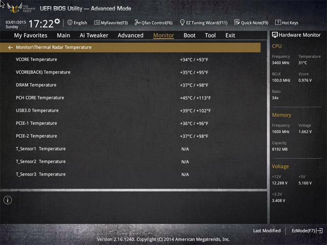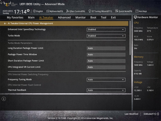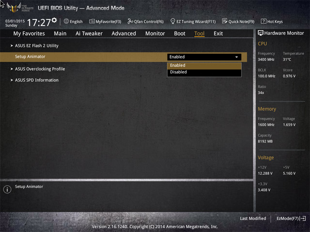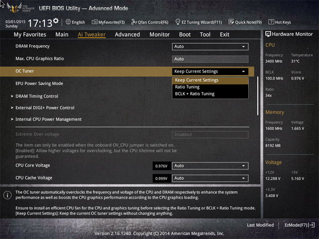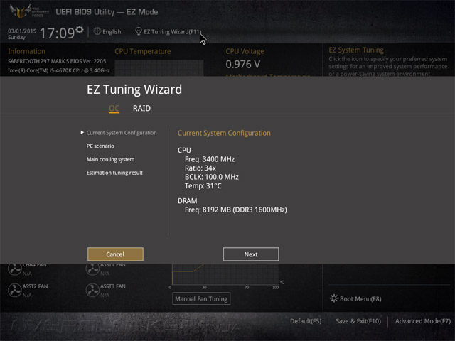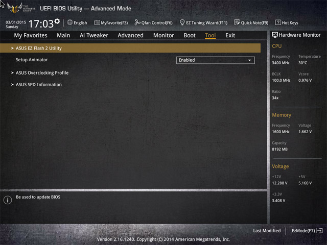 Продукция серии TUF обладает характерной темой оформления UEFI, удобный нейтральный цвет фонового рисунка способствует быстроте в поиске необходимых пунктов меню. Первоначальный мастер настройки EZ Mode поможет установить текущие дату и время, выбрать язык локализации интерфейса, воспользоваться мастером по разгону и конфигурированию массива RAID, вручную активировать профиль XMP для DRAM (в случае наличия), настроить работу основных охладителей путём выбора одного из готовых профилей. Но в нашем случае прибегать к такому методу будет глупо, ведь всё обилие возможностей сосредоточено в среде фирменного ПО.