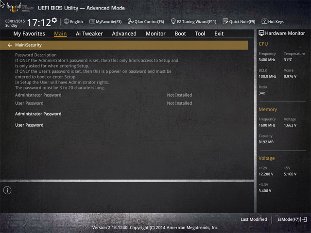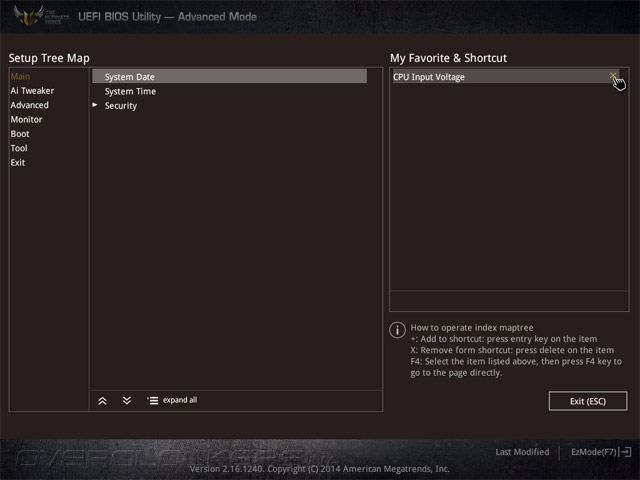 Расширенный Advanced Mode обладает всем комплексом настроек. Первая страница позволяет агрегировать избранные пункты для моментального доступа к ним. Их можно легко добавлять (F3) и удалять. Раздел Main содержит справочную информацию об используемых системных компонентах и версиях программных модулей. Здесь можно ограничить доступ, установив пароль администратора или пользователя системы.