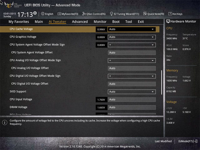 | CPU Cache Voltage Override (В) | 0,001–1,92 | 0,001 |