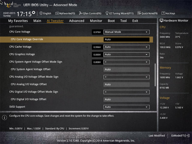 | CPU Core Voltage Override (В) | 0,001–1,92 | 0,001 |