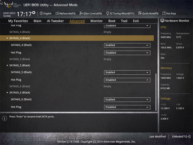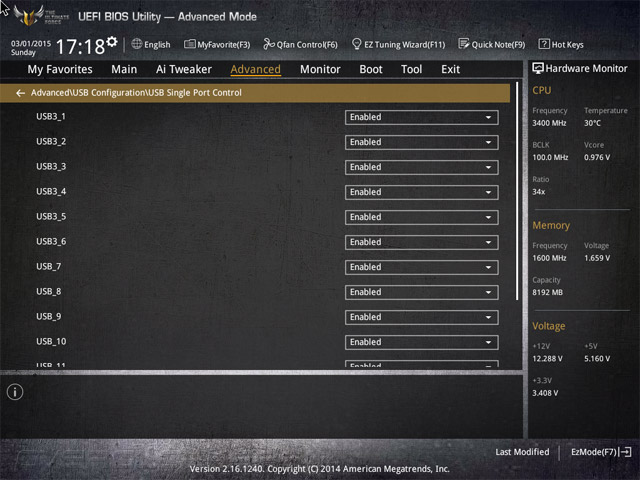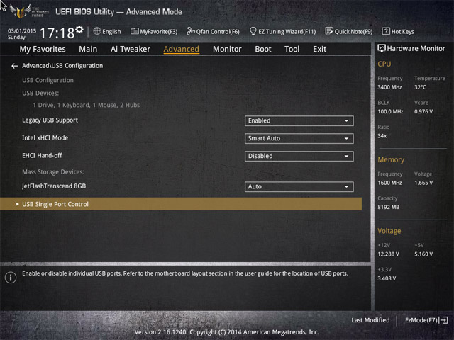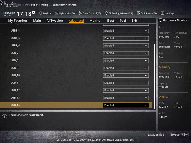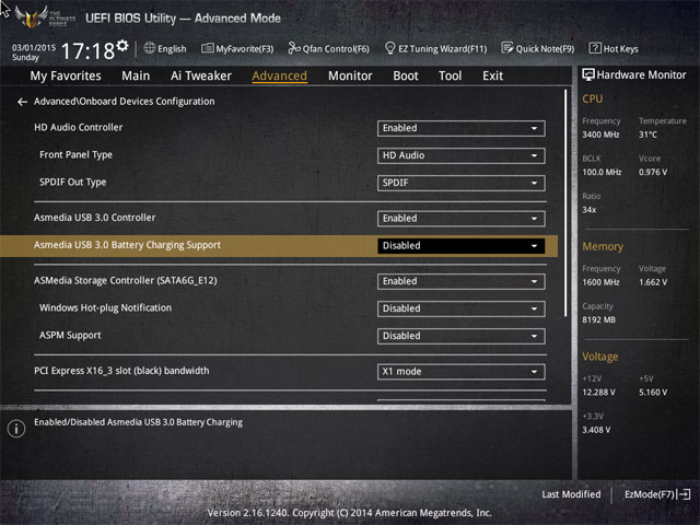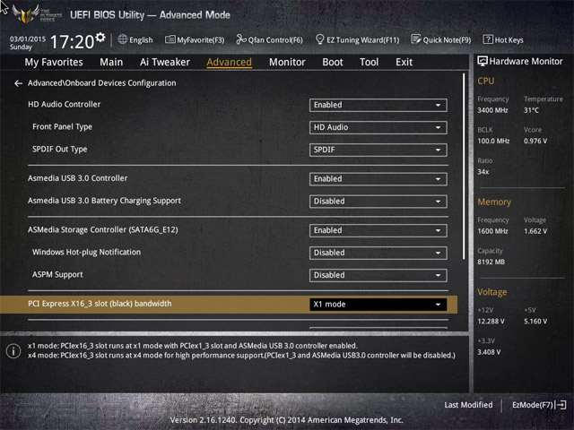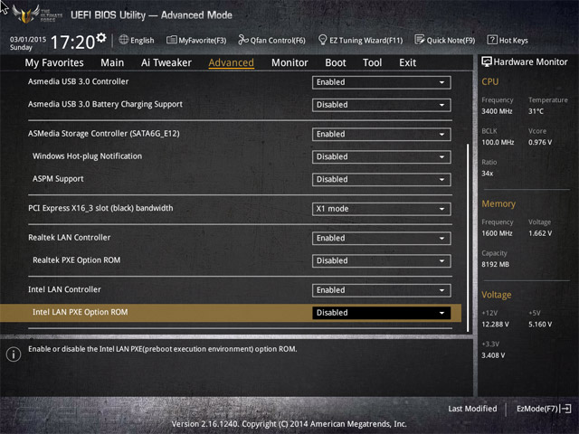 На вкладке Advanced размещен спектр настроек периферии. Здесь можно отключить ненужные в работе контроллеры, повлиять на функционирование нижнего порта PCI-E. Традиционно доступна возможность отключения каждого из портов USB и другие функции, свойственные всем платам от ASUS.