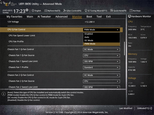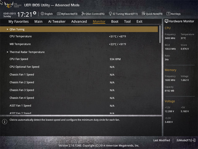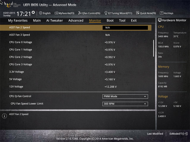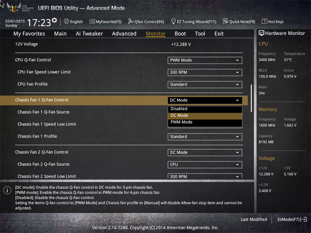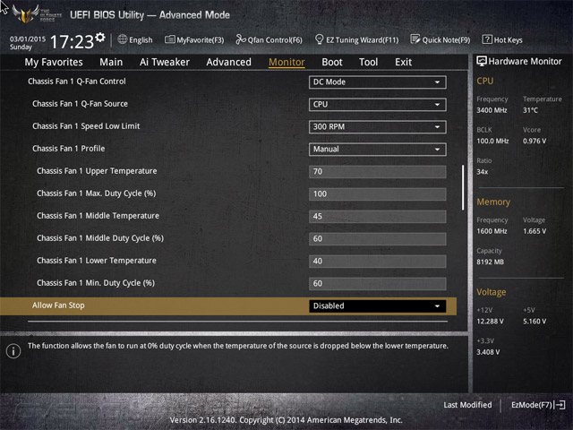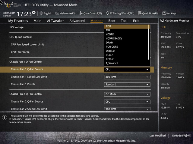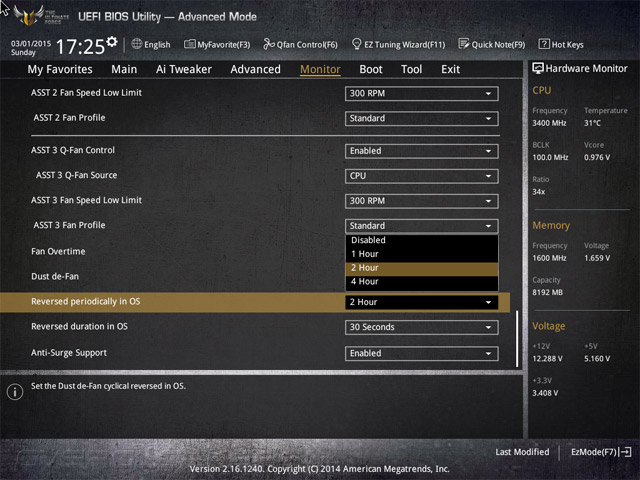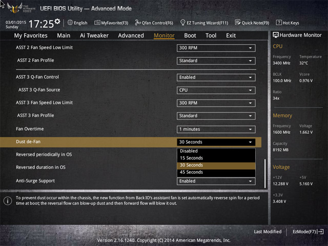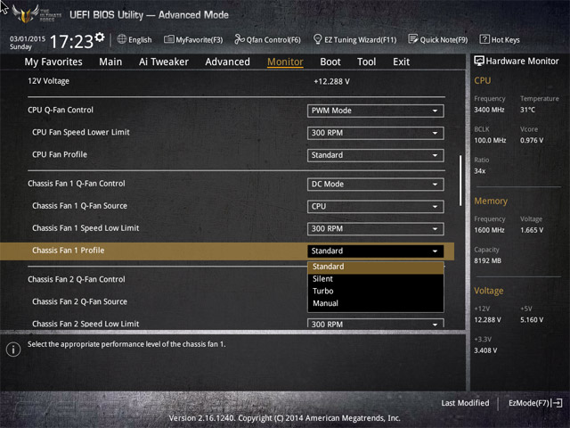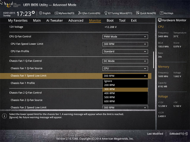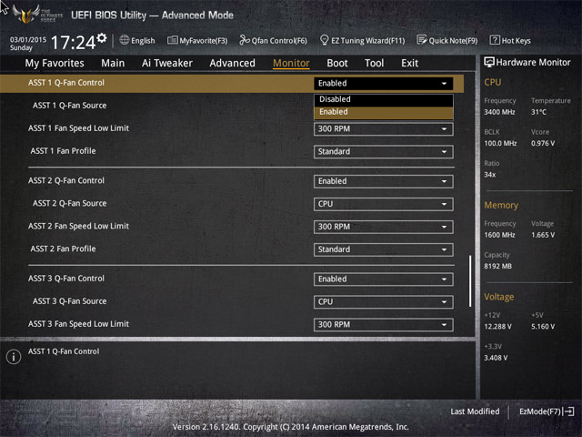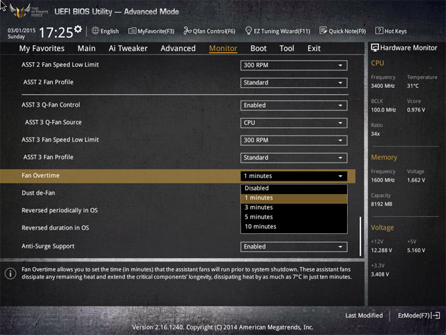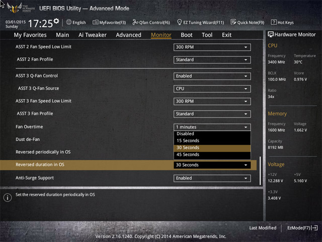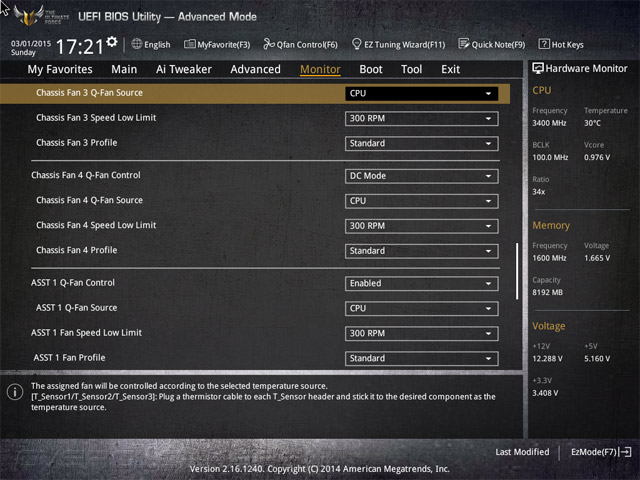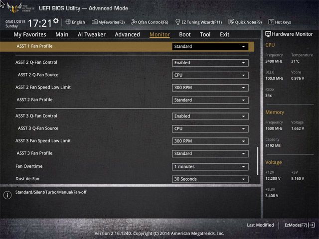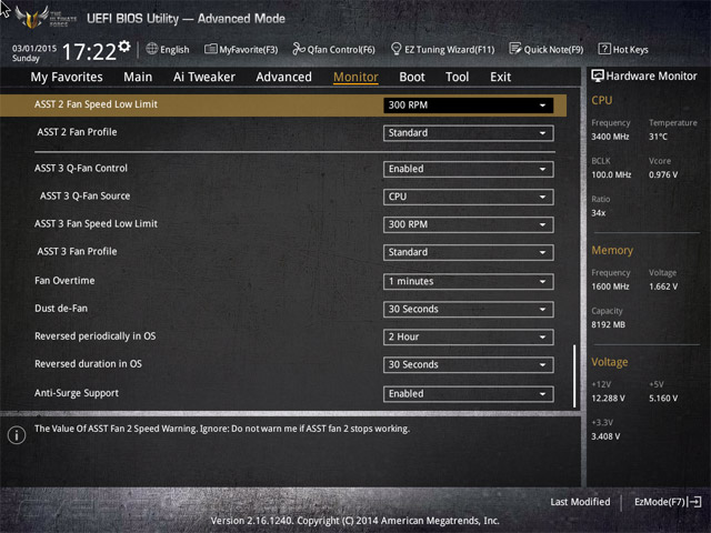 Раздел Monitor вобрал в себя множество информации. Здесь сосредоточены сведения о работе всех охладителей, данные от температурных датчиков. Вентиляторы, подключенные к традиционным гнёздам (не имеющих маркировку ASST) могут использовать два метода, изменяющих частоту вращения, тогда как для вспомогательных доступен только один нативный режим. В самом низу раздела находится инструментарий по настройке работы охлаждения системы после завершения работы, то есть некоторое время вспомогательный вентилятор сможет продувать воздух, охлаждая компоненты. Кроме того, тут же задаётся период его вращения в обратном направлении, что призвано помочь в борьбе против накопления пыли. Сами же вентиляторы лучше всего настраивать из среды операционной системы посредством фирменного ПО, где находится множество удобных функций для контроля за параметрами.