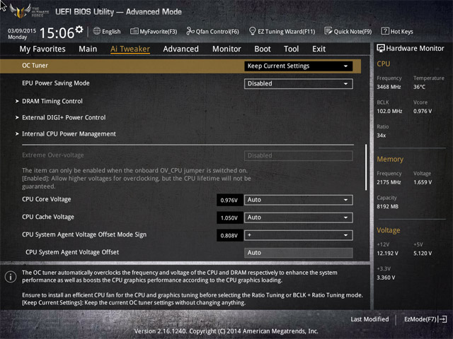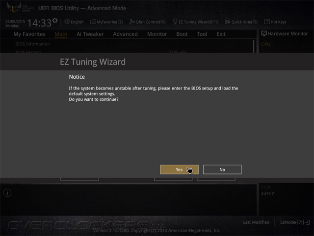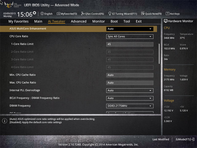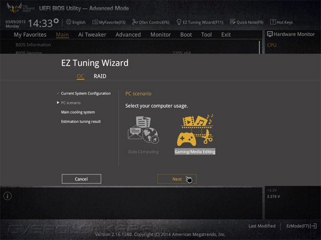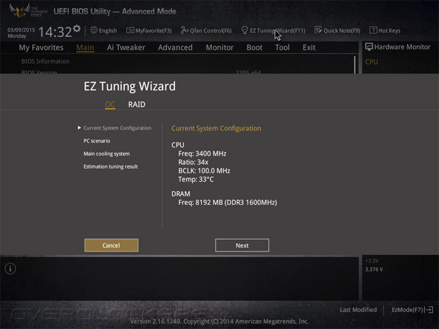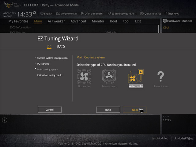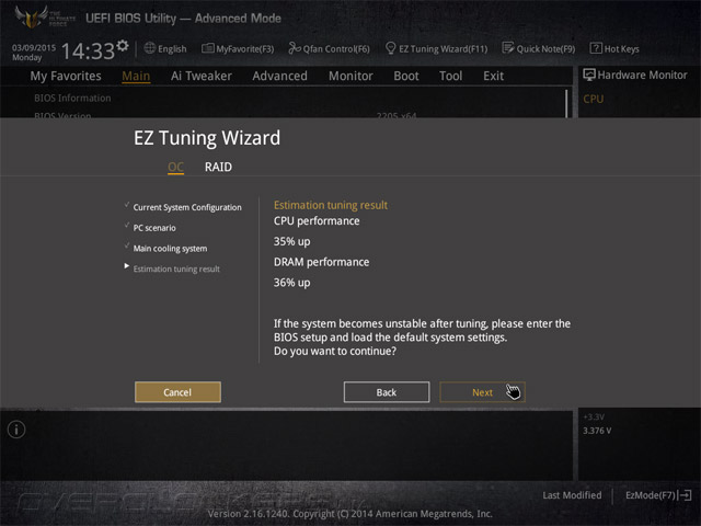 Штатные сценарии увеличения быстродействия системы от модели к модели не отличаются у продукции ASUS, поэтому остаётся лишь подтвердить успешность их выполнения на текущей подопытной. Начнём проверку с механизма EZ Tuning Wizard. Граничным значением разгона являются сценарии Gaming/Media Editing и Water cooler, выступающего в роли схемы охлаждения CPU. Заявляется ожидаемый прирост на уровне 35% для частоты ЦП и 36% — для модулей ОЗУ.