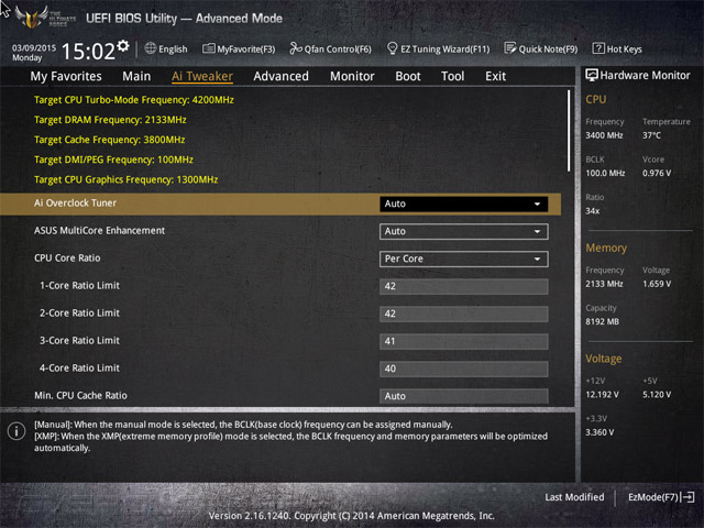Другим путём является использование готовых профилей OC Tuner. Всего их два, первый имеет название Ratio Tuning. При использовании Turbo Boost, максимальная частота может достигать 4,2 ГГц, для ОЗУ вновь форсируется имеющийся профиль XMP с повышением напряжения до 1,65 В.