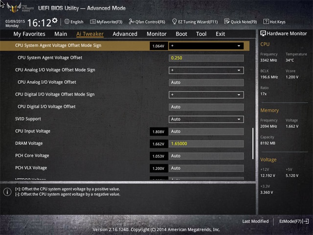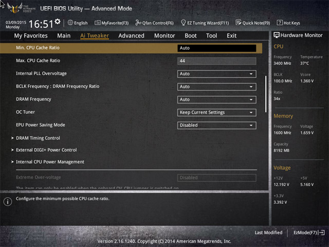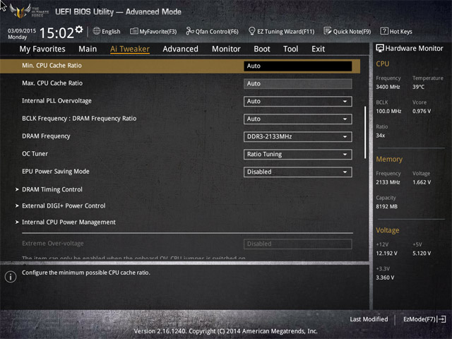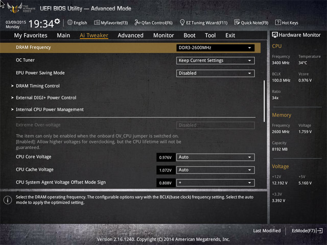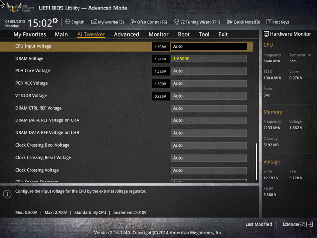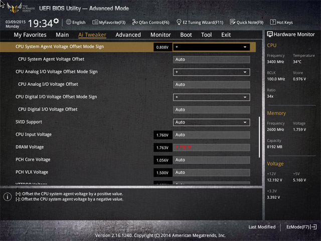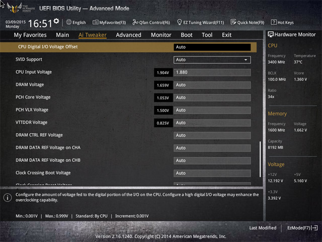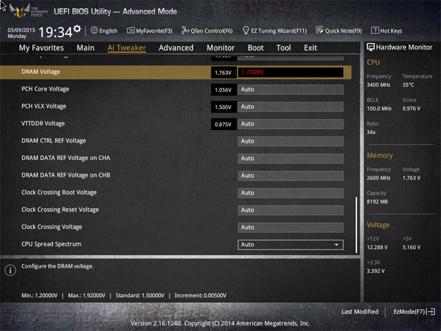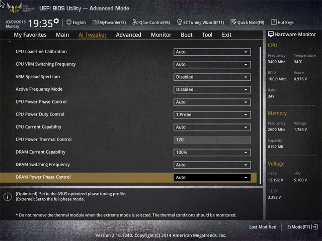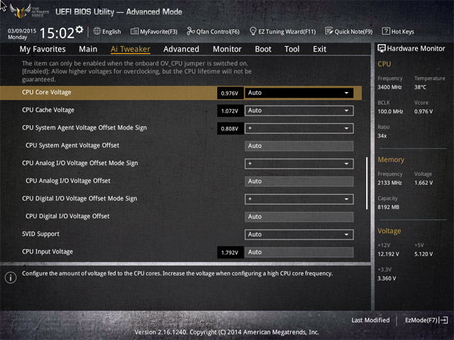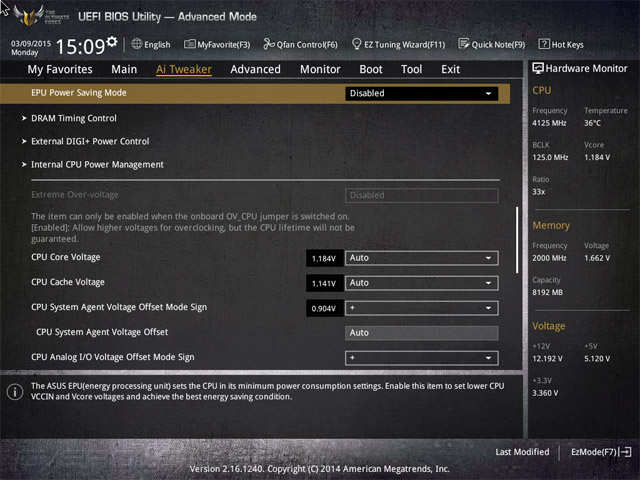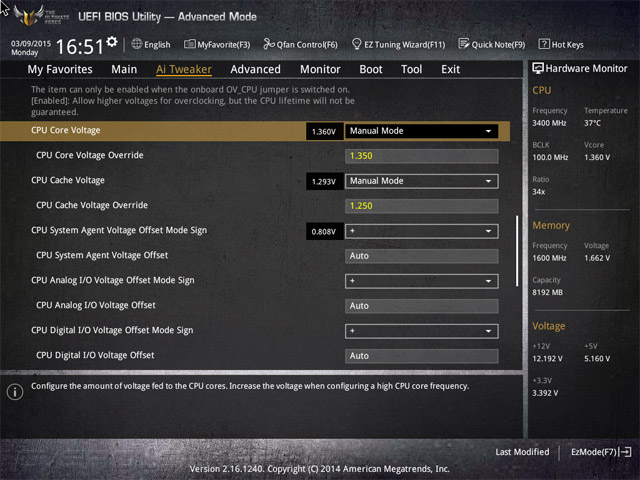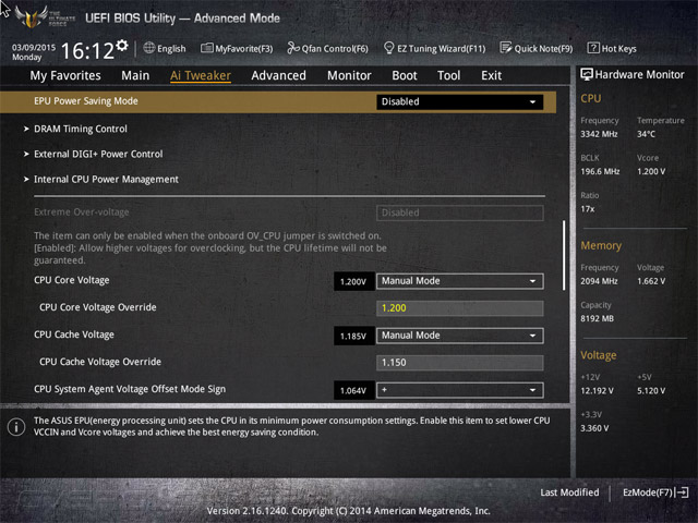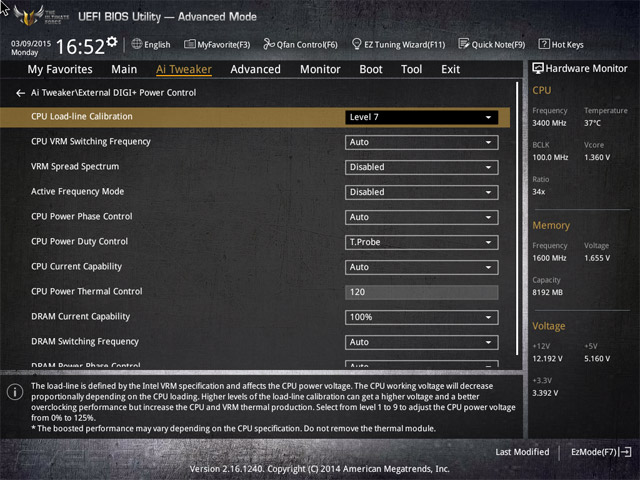 Единственное, что расстроило — стабилизационные возможности CPU VRM. Вне зависимости от выбора профиля, разброс между нижним и верхним действующими значениями оказывается очень большой. Я опирался на срединный уровень с небольшим запасом, для уверенности. Всё это вылилось в отметки 1,88 CPU Input Voltage и Level 7 для CPU Load-line Calibration. Для кольцевой шины устанавливалось значение 1,25 В с традиционным его последующим ростом, свойственным всем платам на основе Z97, до искомых 1,3 В.