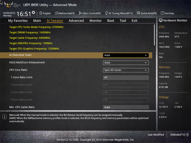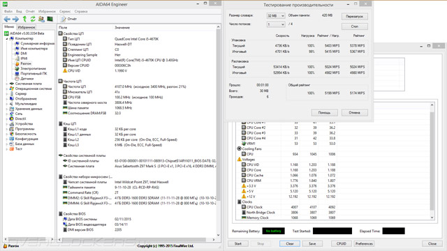 Для раскрытия частотного потенциала Core i5-4670K необходимо зафиксировать питающее напряжение на отметке 1,9 В. Это позволит функционировать вычислительной части на частоте 4,7 ГГц при 1,35 В, а кольцевой шине — на 4,4 ГГц при 1,3 В. C этим заданием Sabertooth Z97 Mark S тоже справилась.
