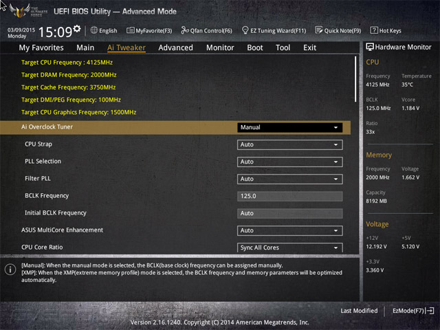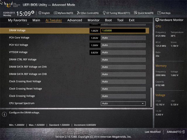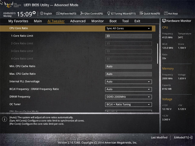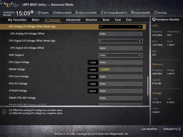 BCLK + Ratio Tuning является вторым профилем. В этот раз Turbo Boost не используется, частота ЦП растёт до 4125 МГц, а для ОЗУ она оказалась снижена до 2000 МГц, хотя все настройки опять базируются на содержимом XMP, в том числе и напряжение, повышенное вновь до 1,65 В.