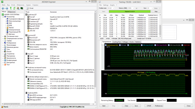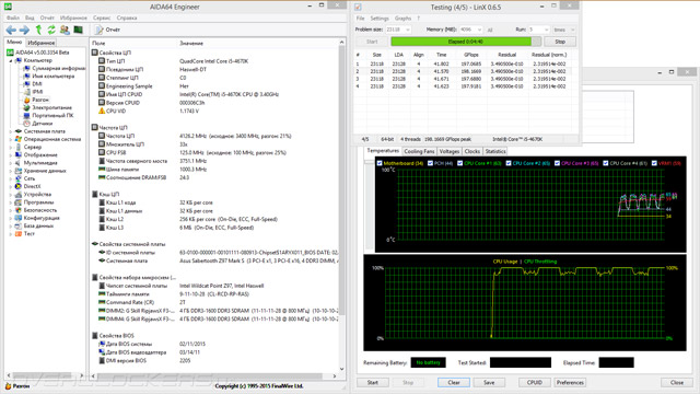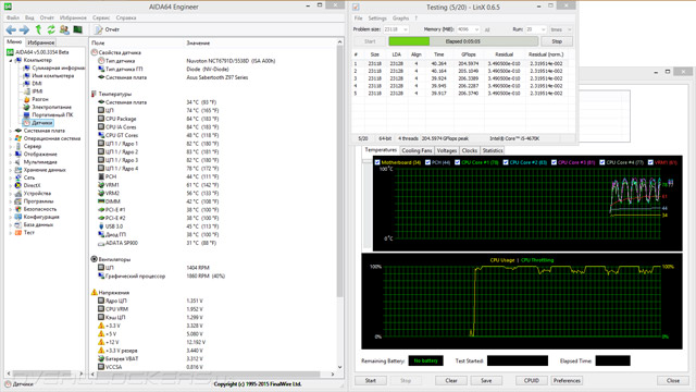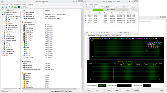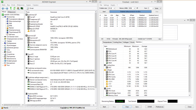 Испытания проводились без вспомогательных вентиляторов при открытых заслонках. Измерить традиционными путями (пирометром) действующую температуру на радиаторе в таком виде несколько проблематично. Наиболее горячий участок, лишённый защитных экранов, прогревался до 58 °С. В это время датчик, размещённый в области VRM, сообщал о значении 62 °C, то есть получаемые с него данные выглядят правдоподобными. Потребление стендом в ходе разгона укладывалось в границы 107–305 Вт. Это больше, чем на схожей по позиционированию Z97-PRO(Wi-Fi ac), вероятно, всё это является следствием некачественной стабилизации напряжения.
