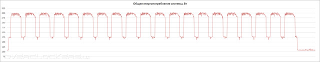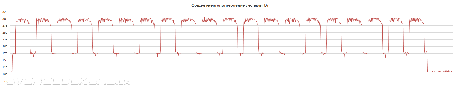 Замеры выполнялись после прохождения всех прочих тестов в «устоявшемся» режиме компьютера при помощи прибора собственной разработки. Методика заключалась в фиксации средневзвешенного значения потребления тестового стенда «от розетки» во время прохождения теста Prime95 с применением профиля In-place large FFTs а также при простое компьютера после завершения теста.