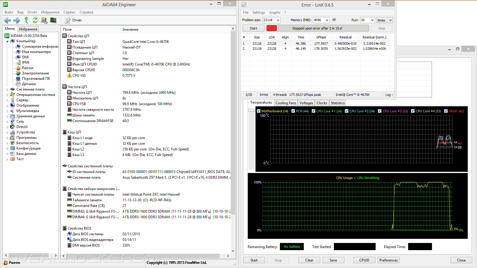 Напряжение ЦП оказалось фиксировано на отметке 1,17 В, хотя частота снижалась в моменты бездействия системы. Тестирование завершилось без ошибок.