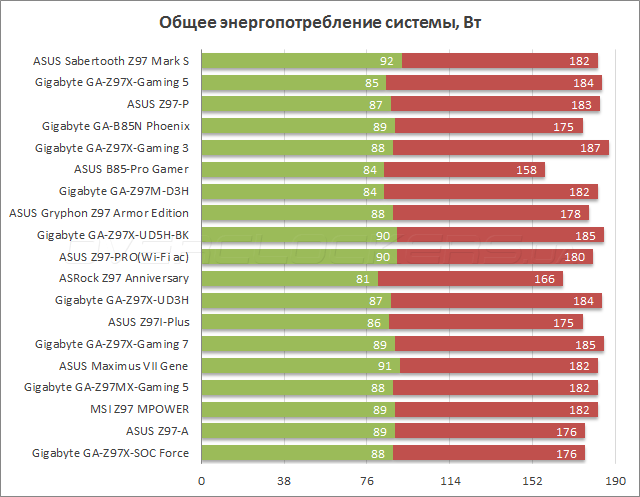 Совокупность факторов — присутствие на PCB большого числа сторонних контроллеров, а также не самый эффективный стабилизатор питания ЦП — незамедлительно сказывается на общем уровне потребления электроэнергии. К счастью, производителем предусмотрен механизм по борьбе с таким неприятным явлением, это EPU Power Saving Mode. Путём понижения CPU Input Voltage (из очевидных мер) достигается эффект в виде границ потребления 87–176 Вт, при этом общее быстродействие системы не страдает, поэтому этим трюком можно призвать воспользоваться всех пользователей.