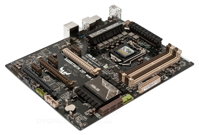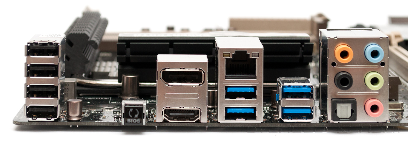 Что касается возможностей подключения периферии, то ASUS Sabertooth Z97 Mark 2 располагает шестью чипсетными каналами USB 3.0, из которых два выведены на заднюю панель, а остальные четыре представлены в виде внутренних разъемов. За работу еще двух разъемов USB 3.0 отвечает контроллер ASMedia ASM1042Е, правда, при его использовании третий слот PCI Express 2.0 x16 переходит в режим х16@x2. Сетевая подсистема базируется на чипе Intel I218V, а в качестве аудиокодека используется 7.1-канальный Realtek ALC1150. В итоге, на задней панели материнской платы нашлось место для: