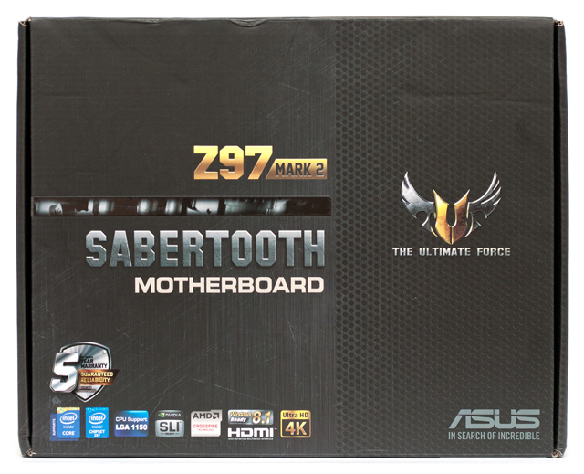 Материнская плата поставляется в картонной коробке средних размеров, ее дизайн однозначно говорит о принадлежности ASUS Sabertooth Z97 Mark 2 к семейству The Ultimate Force. Лицевая поверхность оформлена скромно, на серо-стальном фоне, имитирующем текстуру металла, нанесено наименование модели, значок серии TUF, а также несколько логотипов, отражающих ключевые особенности новинки.