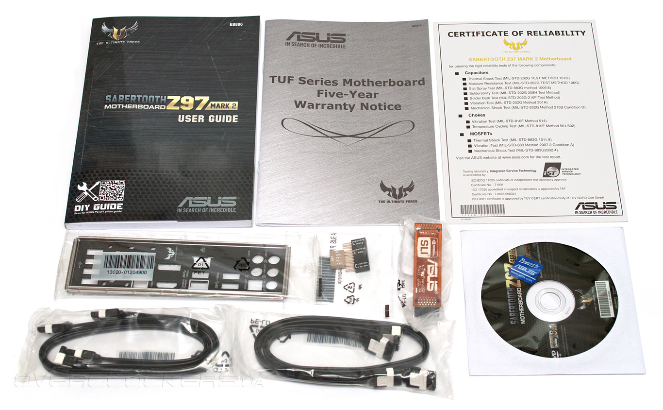 Комплект поставки ASUS Sabertooth Z97 Mark 2 весьма скромный, но он включает все необходимые компоненты для сборки ПК: