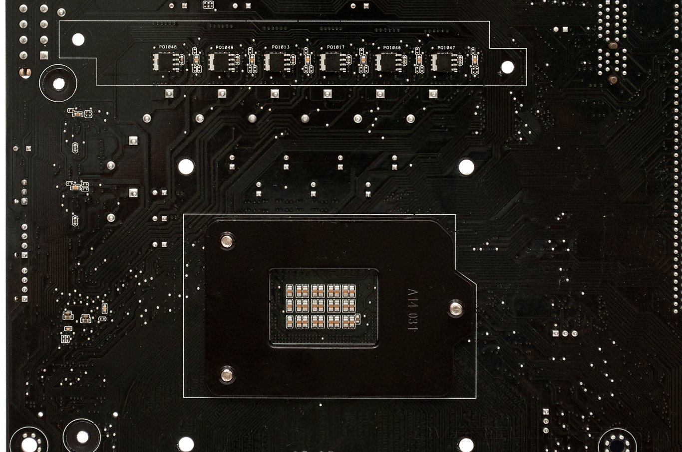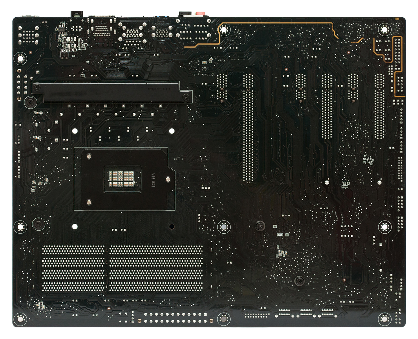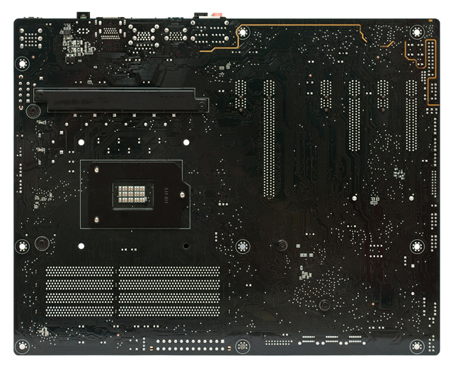 С обратной стороны печатной платы в районе процессорного разъема видна металлическая пластина, охлаждающая часть силовых элементов. К счастью, она не мешает установке кулеров, даже таких массивных как Thermalright Silver Arrow.