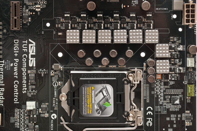 Как и подобает модели из семейства TUF новинка обладает эффективной системой охлаждения VRM, состоящей из пары радиаторов, соединенных тепловой трубкой. На подошвы охладителей нанесен термоинтерфейс непривычной консистенции: он зернистый и очень рассыпчатый, так что лучше воздержаться от демонтажа радиаторов без особой необходимости.