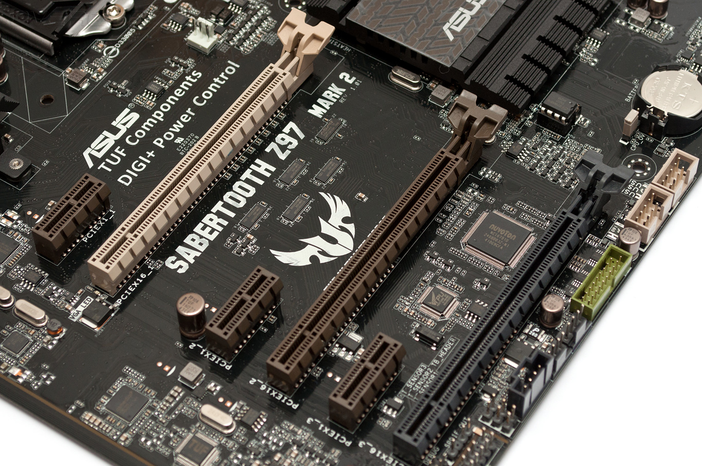 Поскольку ASUS Sabertooth Z97 Mark 2 лишена защитного кожуха Thermal Armor, то ничто не мешает сразу изучать ее конструкцию. Нельзя не отметить удобное расположение всех основных узлов. Для установки модулей ОЗУ стандарта DDR3 имеются четыре слота DIMM, которые позволяют использовать 32 ГБ оперативной памяти.