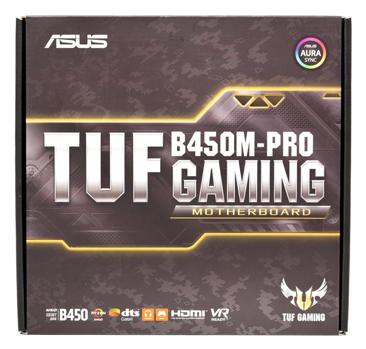 По информации, изложенной на лицевой стороне коробки, можно узнать о поддержке фирменной подсветки (Aura Sync), наличии порта HDMI и бонуса для звуковой составляющей — DTS Custom. Используется плотный картон с качественной полиграфией в матовом стиле.