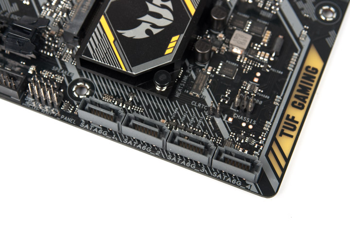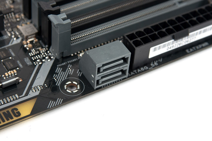 Всего есть шесть портов SATA, четыре штуки смещены к нижней грани, они поперечного типа, ещё два сдвинуты повыше, их тип уже продольный.