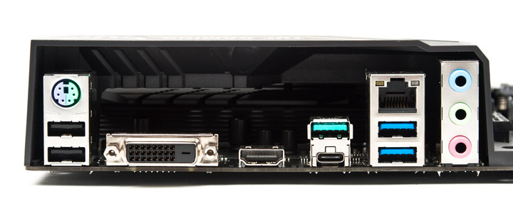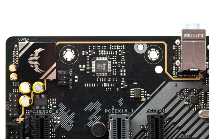 Больше всего внимание к себе приковывают необычно большие радиаторы, не обошлось и без колпака для задней панели, изготовленного из пластика. В остальном продукт вполне рядовой, нет кнопок, переключателей, индикаторов состояния, кодов POST и даже упрощённого диагностического набора Q-LED. Сброс настроек CMOS проводится путём замыкания пары контактов. Отверстий для фиксации места положения в корпусе — восемь.