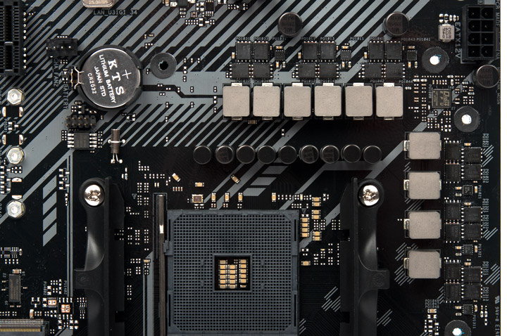 Построение стабилизатора напряжений CPU и SOC существенно не изменилось, воспользовались прежней схемой, которая встречалась во всех недорогих платах, участвовавших в наших обзорах, её лишь усилили. Тот же ШИМ-контроллер — перемаркированный ASP1106GGQW, те же транзисторы — NTMFS4C10B и NTMFS4C06B производства ON Semiconductor, прежние «4+2 фазы», вот только теперь в состав каждой входит удвоенное число силовых элементов. Для процессорного напряжения нарастили и количество дросселей. Выделить можно наличие шести дискретных управляющих драйверов. Все транзисторы поделили поровну, отведя по 12 штук под каждый из охладителей. Вскоре узнаем, как всё это повлияло на поведение VRM и его температурный режим.