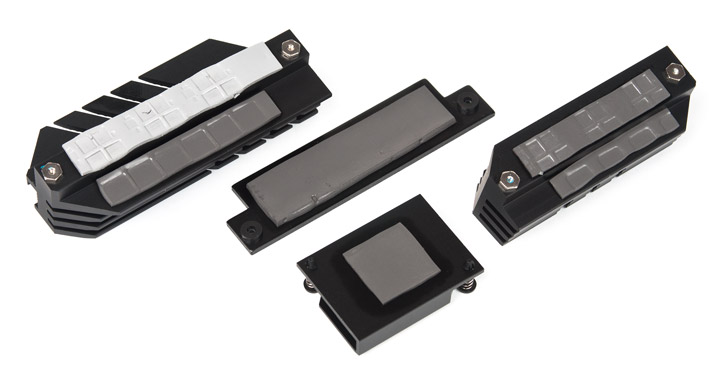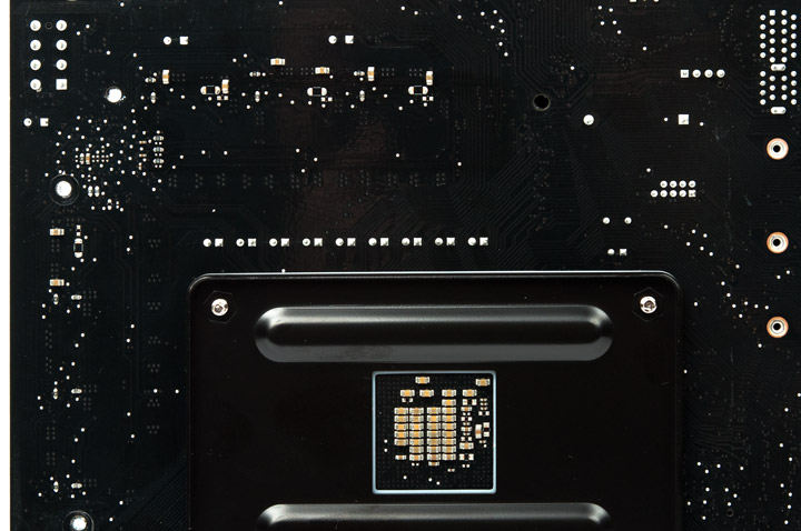 Больший радиатор дополнен усилительной пластиной, крепящейся с тыльной стороны, она прямым образом участвует и в отведении тепла ввиду используемой тут термопрокладки. Электронные компоненты практически отсутствуют.