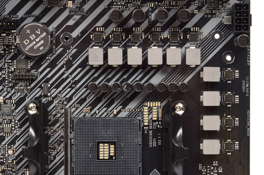Сектор VRM также имеет много родственных связей с прежде рассмотренными моделями TUF Gaming. Видим всё тот же ШИМ-контроллер — ASP1106GGQW. Его функции организуют схему работы вида «4+2 фазы». Для напряжения ЦП число элементов — сборок и дросселей — удвоено, а у SOС Voltage уже по одной штуке на канал, таким образом, всего можно насчитать десяток SiC639 от Vishay Intertechnology. Ещё можно выделить присутствие усиленного восьмиконтактного гнезда питания, где используются литые проводники.
