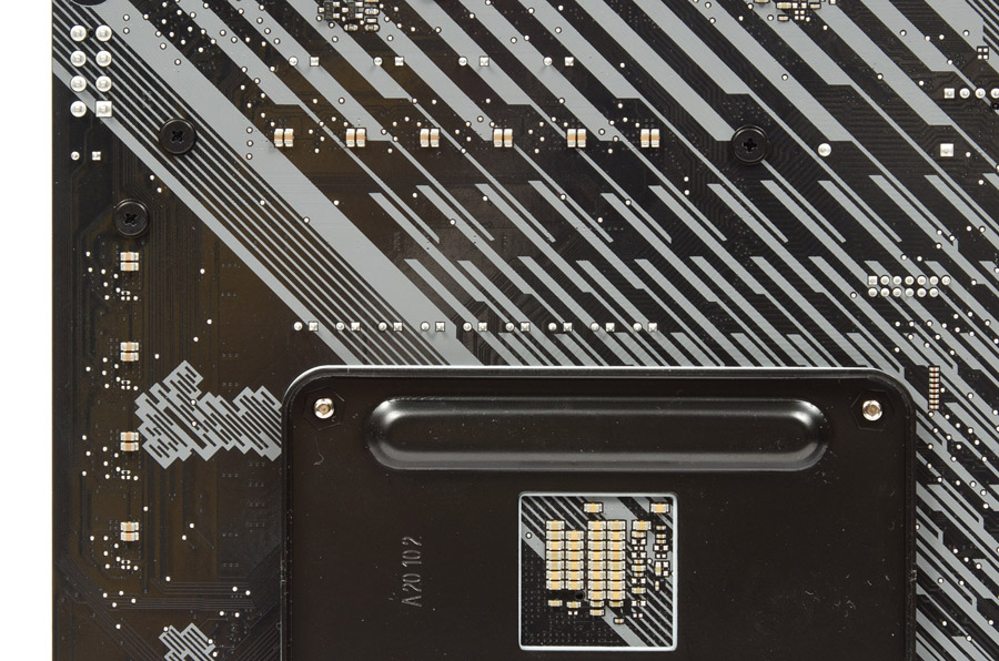 Отмечу отказ от декоративного пластикового «навеса» над портами ввода-вывода задней панели в пользу увеличенного в размерах радиатора VRM. Это довольно сильно напоминает решения, реализованные прямыми рыночными конкурентами. Вот только здесь увлеклись достаточно сильно — «размах» в высоту может вызвать проблемы совместимости в особо тесных корпусах с корпусными вентиляторами, расположенными над ВК.