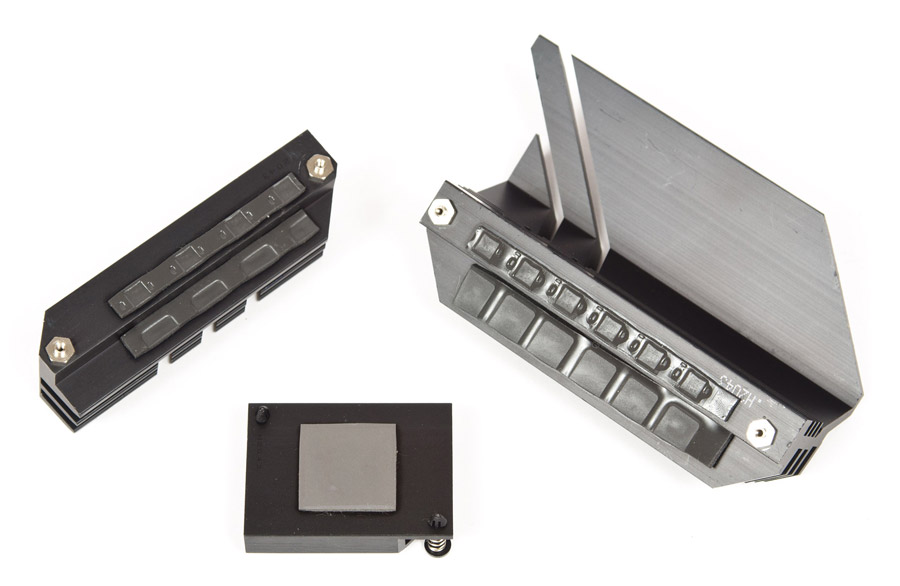 Усовершенствованный радиатор с «гребнем» имеет достаточную площадь поверхности для отбора тепла у силовых элементов. С площадью термопрокладки для сборок — полный порядок, а для дросселей обошлись по остаточному принципу. У другого радиатора ситуация похуже. Имеется явный недостаток площади у прокладки для сборок, а дросселями, похоже, воспользовались как третьей точкой упора, про отвод тепла там речь идёт, разве что, символическая. Зато подобных проблем нет с охладителем под устройства типа M.2.