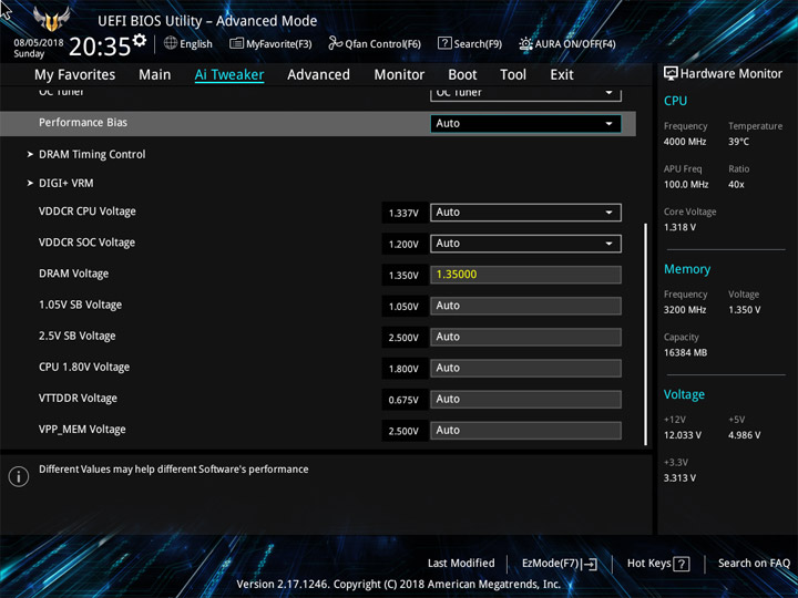 По всей видимости, напряжение не менялось относительно штатных позиций, ПК работал без сбоев. Они, вероятно, прежде были вызваны несовпадением высших частотных отметок и действующего уровня CPU Voltage, необходимого для этого.