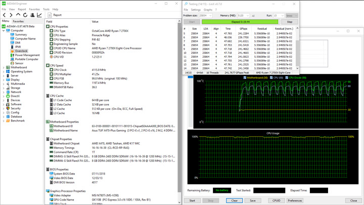 Разгон DRAM оказался невыдающимся, но осуществимым. Нет возможности точно отследить напряжение на модулях, приходится довериться установкам в UEFI. Активный статус XMP в лице работы D.O.C.P. является одним из упрощённых способов оверклокинга системы и работает он буквально в один клик. Наибольшие замечания тут вызвала прочность стабилизатора напряжений. Уже в штатном режиме эксплуатация Ryzen 7 2700X вызывает проблемы в LinX, вызванные, вероятнее всего, конфликтом активных ускоряющих формул (XFR и Precision Boost второй ревизии) и необходимого для повышенной частоты уровня CPU Voltage. Но при этом перегрева не наблюдается, работу можно будет стабилизировать, подбирая профили LLC или (и) меняя частоту ШИМ. При оверклокинге температура узла VRM растёт достаточно быстро, чтобы ощутить работу защитных технологий, потому про выход за штатные частотные границы старших моделей ЦП тут можно и не помышлять. Возможно, с шестиядерными моделями и их разгоном не предельного характера ситуация будет получше.