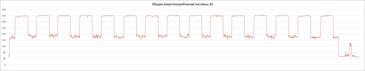 Нагрев не изменился относительно случая работы памяти на штатных 2400 МГц, активная работа фонового охлаждения стала хорошим подспорьем. Потребление сформировало коридор из 51 и 323 Вт. Сравнивая эти цифры с другими устройствами, нетрудно констатировать явно ухудшенный КПД и уход в тепло лишних ватт энергии. Пять единиц в общую картину добавил привлечённый нагнетатель воздуха.