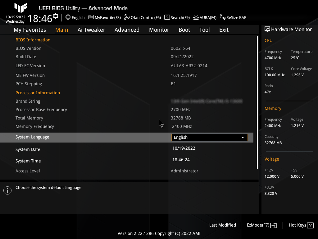 После нажатия на F7 переходим в привычный режим и сразу оказываемся в разделе Main, в котором находится информация о системе и параметры администрирования.
