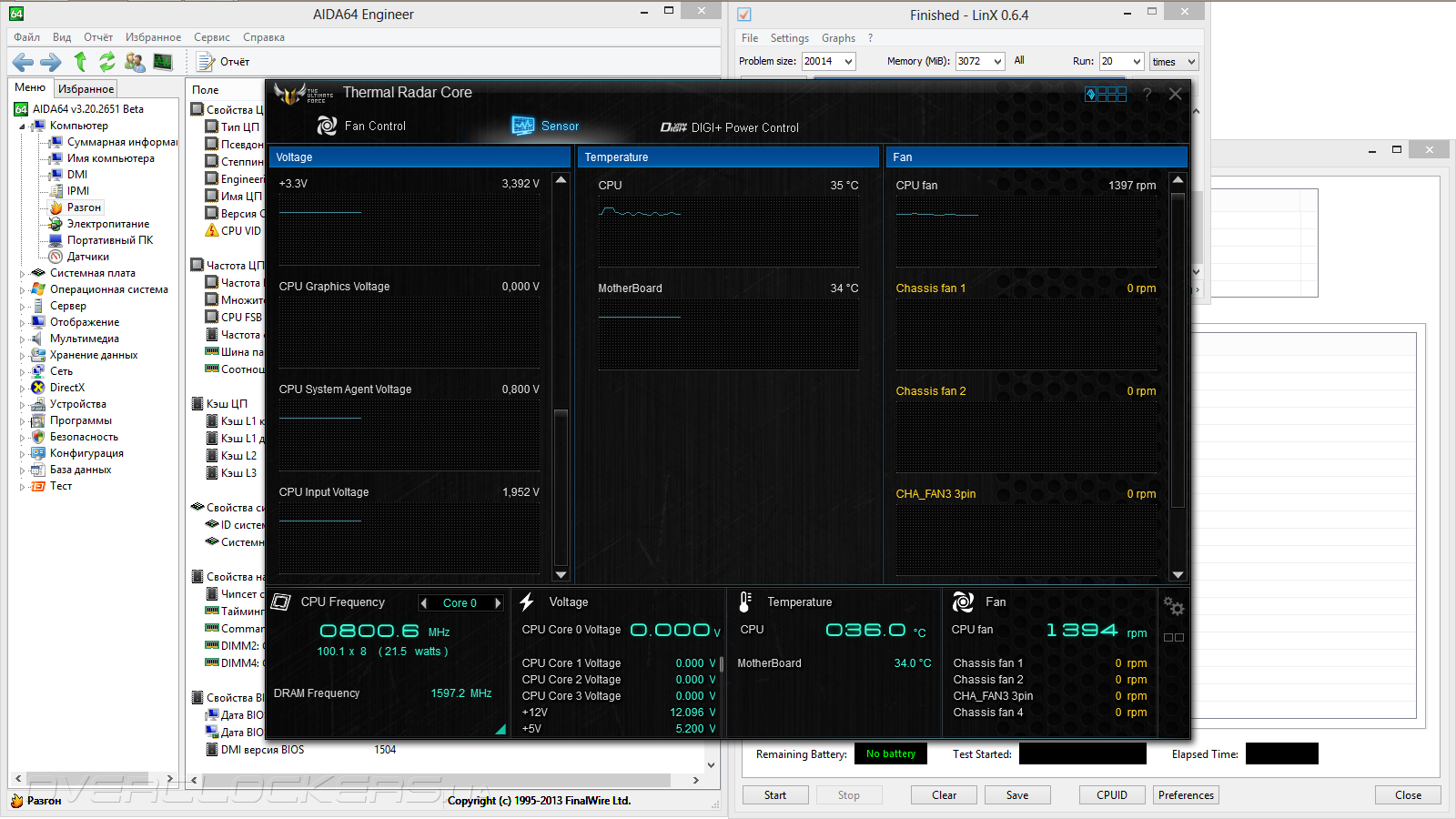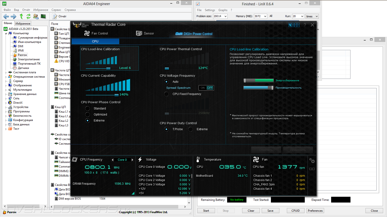 Некоторое время отнял поиск оптимального значения Load Line Calibration. В положении Auto и при 1,95 В для CPU Input система демонстрировала нестабильность в работе. Для мониторинга напряжений мы использовали возможности Thermal Radar Core. Однако, как выяснилось, в моменты интенсивной нагрузки системы средствами LinX 0.6.4 мониторинг за системными параметрами замирал на продолжительное время, поэтому пришлось идти на «отлавливание» реального значения CPU Input Voltage путём принудительного прерывания хода тестирования. В итоге мы остановились на значении Level 6: в моменты пиковой загрузки ЦП напряжение слегка увеличивалось — на 0,01 В. Этого оказалось вполне достаточно для достижения стабильности. К сожалению, AIDA64 абсолютно не знакома с Vanguard B85 и не отображает даже частоту вращения вентиляторов, не говоря уже о напряжениях на различных узлах платы.