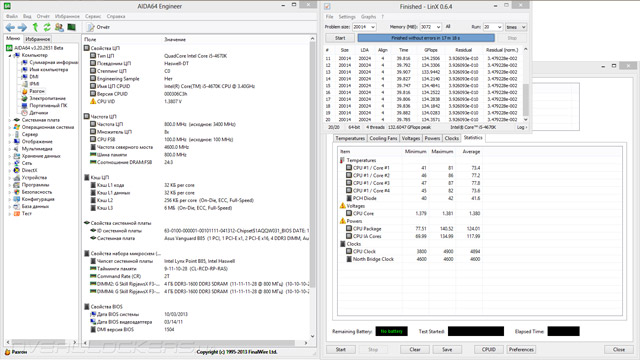 С раскрытием разгонного потенциала нашего экземпляра Core i5-4670K плата полностью справилась. Повысив напряжения CPU и CPU Cache до 1,38 В и 1,29 В, а их частоту до 4,9 ГГц и 4,6 ГГц соответственно, мы добились полной стабильности от системы. В простое функции энергосбережения исправно работали.