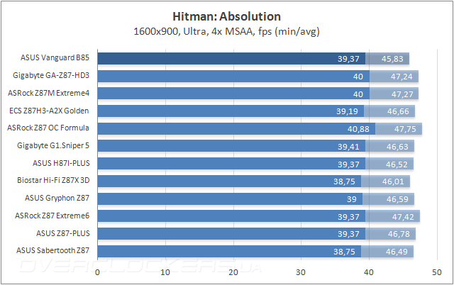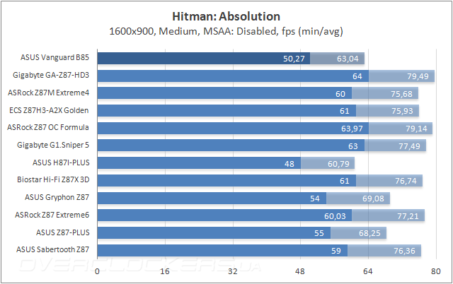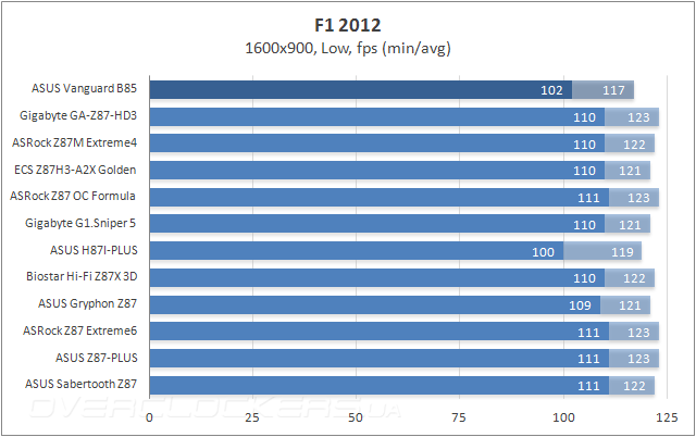 В играх, что не являются излишне требовательными к графической составляющей компьютера, системы на базе B85 и Н87 заметно отстают от общей группы. Серьёзная нагрузка на видеоадаптер это отставание практически нивелирует.