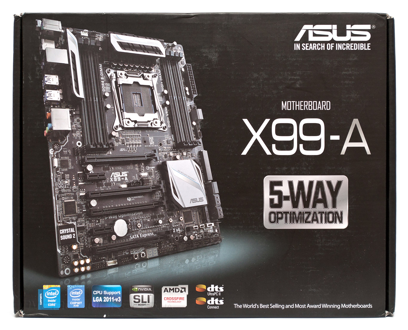 Системная плата поставляется в картонной коробке стандартных размеров, что еще раз подчеркивает скромное место X99-A в табели о рангах ASUS, и лишь дизайн упаковки роднит новинку со старшей моделью X99-Deluxe. Лицевую поверхность украшает изображение «материнки», здесь же нанесено наименование модели и логотип технологии 5-Way Optimization, которая служит для оптимизации параметров быстродействия, энергопотребления, режима работы охладителей и подсистемы питания, а также индивидуальной настройки уровня производительности для каждого приложения.
