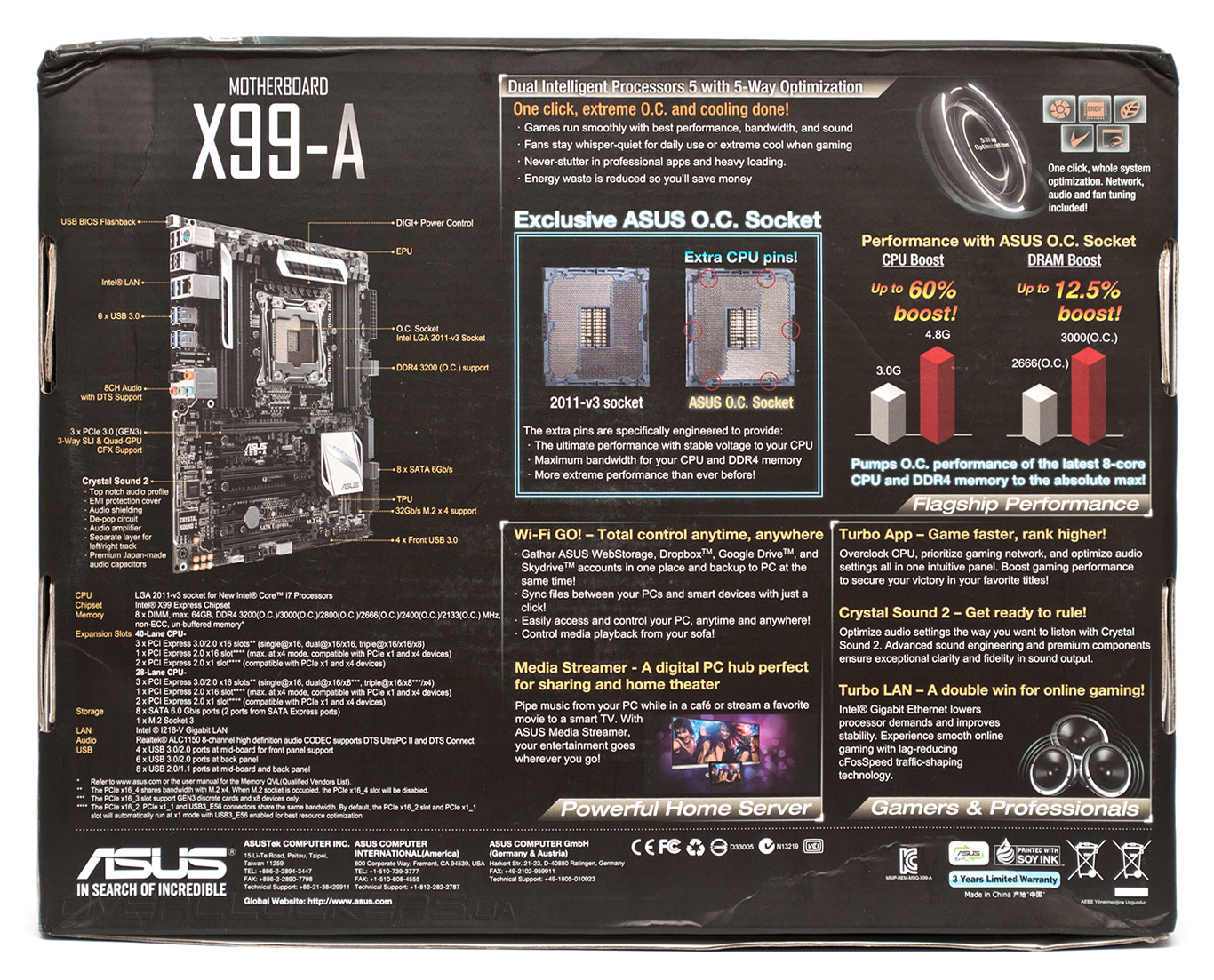 Формально, новинка является младшей представительницей модельного ряда ASUS для платформы LGA2011-3, однако, этот факт вовсе не означает, что ее функциональность или набор оверклокерских инструментов искусственно ограничены. Напротив, X99-A обладает всем необходимым для построения высокоуровневого системного блока. В подтверждение этих слов ниже представлена спецификация материнской платы.