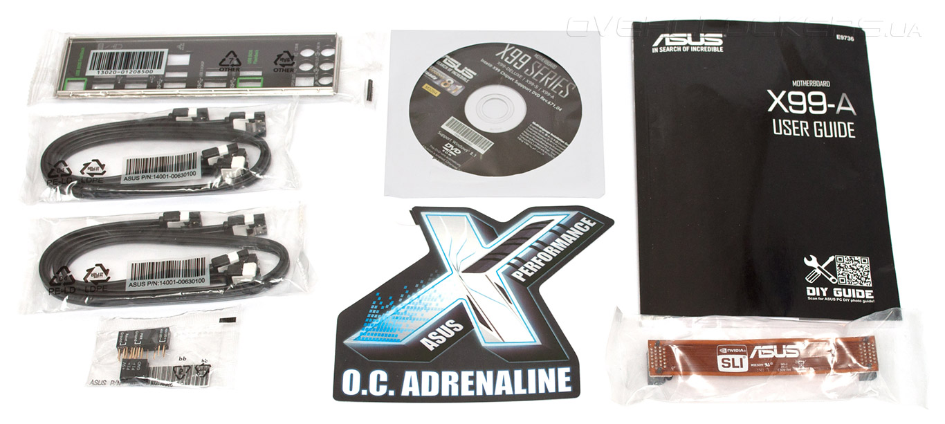 Комплект поставки вновь напоминает о рыночном позиционировании ASUS X99-A, набор дополнительных принадлежностей состоит из: