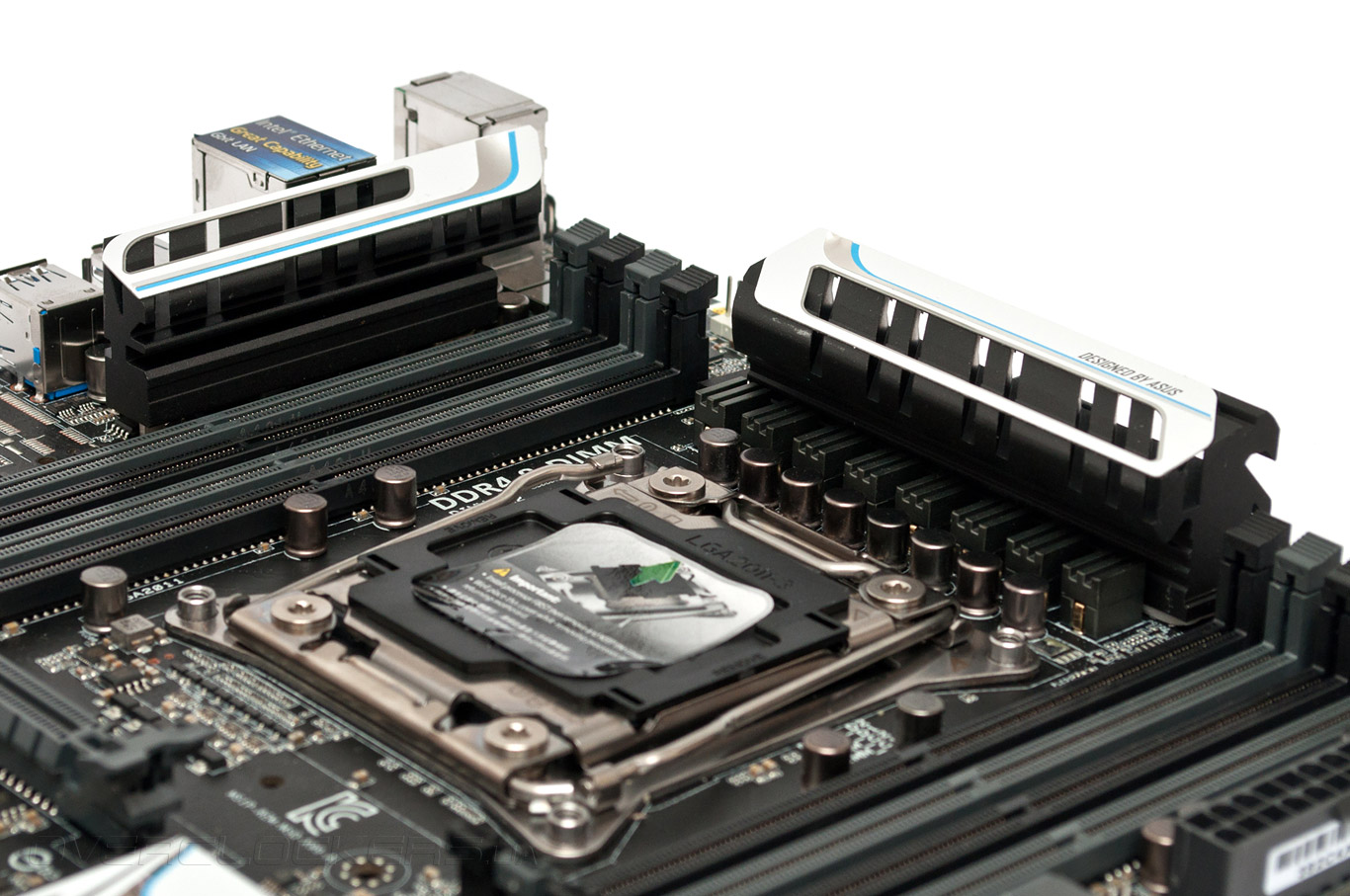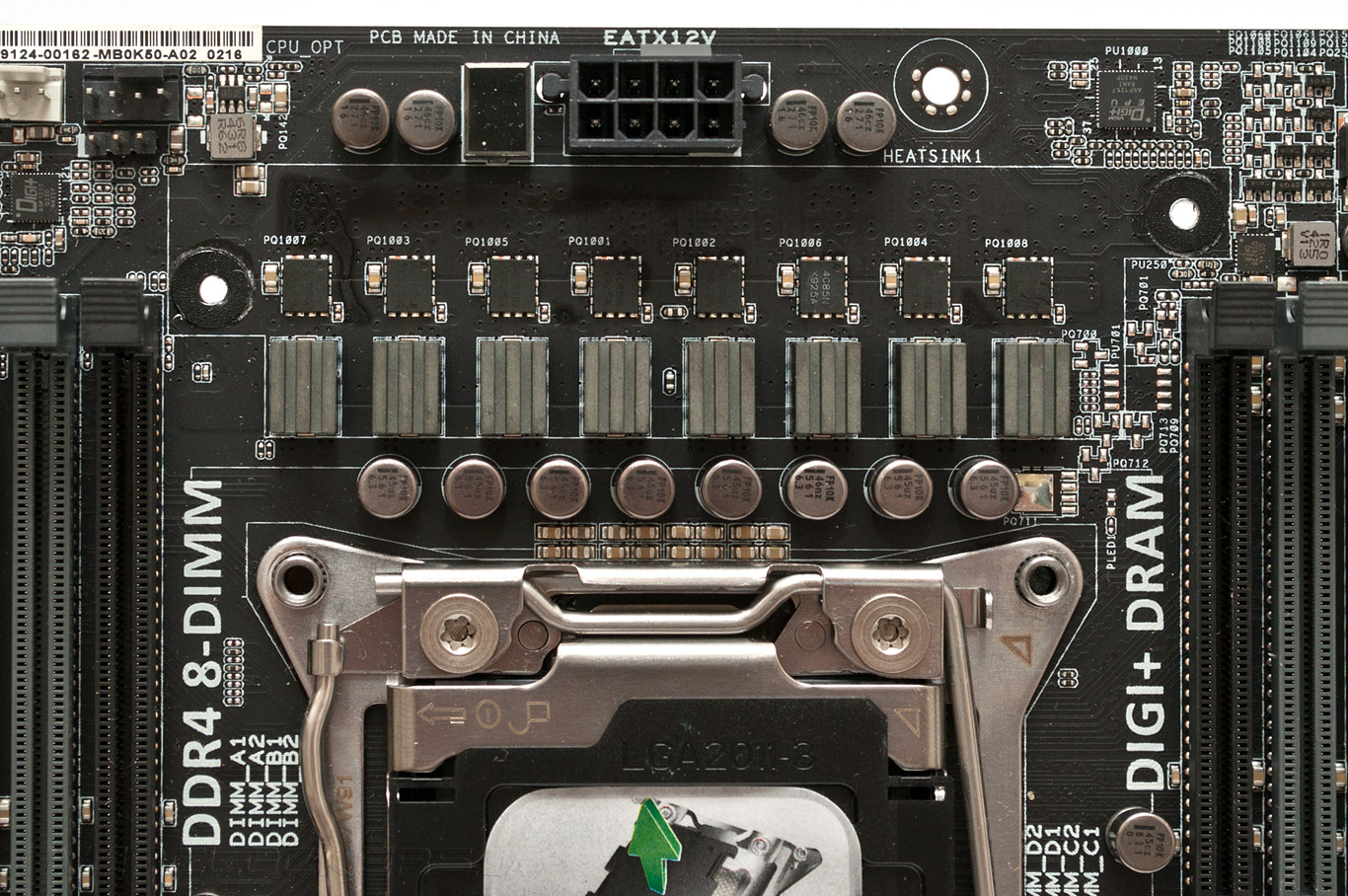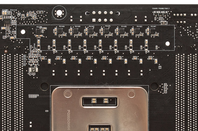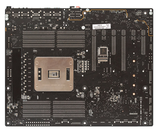 С обратной стороны системной платы находится значительное количество электронных компонентов, в том числе один из двух чипов TPU, отвечающий за функции разгона. Кроме того, в районе процессорного разъема видна металлическая пластина, которая является составной частью системы охлаждения VRM. В то же время, беспокоиться о совместимости крупногабаритных кулеров из-за выступающих элементов на обороте РСВ не приходится, так как большинство процессорных охладителей для платформы LGA2011-3 используют штатную усилительную пластину.