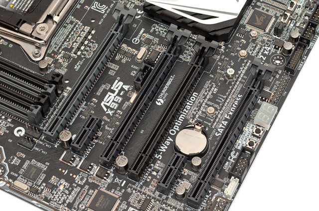 Для организации графической подсистемы ASUS X99-A предлагает три слота PCI Express 3.0 x16, подключенных к процессорному контроллеру, режим работы которых зависит от модели эксплуатируемого CPU. При использовании старших Haswell-E, которые располагают 40 линиями PCI-E, разъемы могут работать по схемам «x16+x0+x0», «x16+x16+x0» или «x16+x16+x8», тогда как в случае установки младших процессоров работа портов PCI Express 3.0 x16 ограничивается режимами «x16+x0+x0», «x16+x8+x0 и «x16+x8+x4». Таким образом, новинка позволяет эксплуатировать одновременно до трех видеокарт с возможностью их объединения в конфигурации AMD CrossFireX и NVIDIA SLI. Третий по счету разъем PCI Express 2.0 x16@x4 подключен к системной логике, но его тоже можно использовать для инсталляции графического акселератора. Также, ASUS X99-A оснащена двумя портами PCI-E 2.0 x1 для установки плат расширения, правда, в случае установки видеоускорителей с массивными системами охлаждения в первые два слота PCI Express 3.0 x16 оба они будут заблокированы.