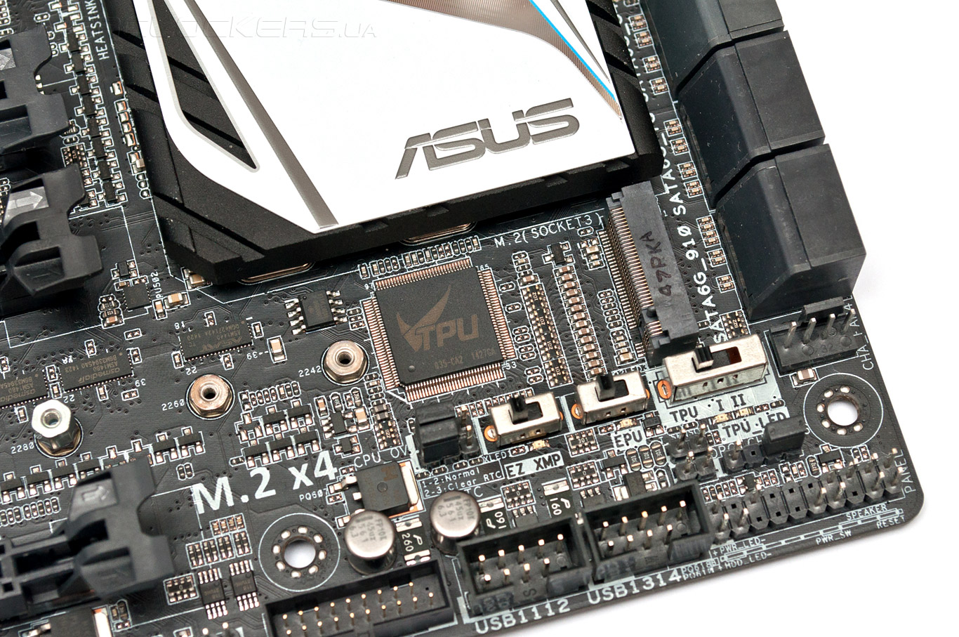 Системная плата оснащена слотом М.2, который можно использовать для эксплуатации твердотельного накопителя формата NGFF с интерфейсом PCI Express. К разъему подведены четыре линии PCI-E 3.0 x1 от процессорного контроллера, которые обеспечивают пропускную способность до 32 Гбит/с. Замечу, что при установке SSD в порт М.2 автоматически отключается четвертый по счету разъем PCI Express 3.0 x16, так что пользователям придется выбирать между инсталляцией третьего графического ускорителя и твердотельного накопителя формата NGFF. Рядом с разъемом M.2 находятся три микропереключателя. Первый из них активирует профиль X.M.P. для модулей ОЗУ, второй служит для включения экономичного режима EPU, ну а третий — трехпозиционный — предназначен для управления функцией автоматического разгона TPU.
