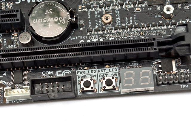 На нижнем крае печатной паты нашлось место для светодиодного индикатора кодов POST, а также кнопок включения и перегрузки, но их конструкция и размещение не располагают к частому использованию даже при работе в условиях открытого стенда. Слева от них находится разъем EXT_FAN, предназначенный для подключения карты расширения Fan Extension Card, которая обеспечивает работу трех дополнительных вентиляторов. Правда, самой платы в комплекте поставки нет, и, сдается мне, что отдельно приобрести ее в наших краях будет весьма непросто.