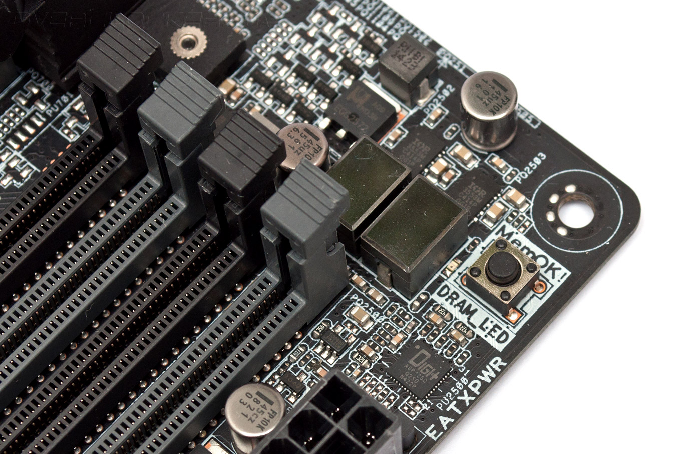 Новинка поддерживает фирменную технологию ASUS MemOK!, которая позволяет войти в UEFI Setup даже в том случае, если установлены неработоспособные параметры ОЗУ. Кнопка управления и светодиод, сигнализирующий о работе функции, находится в правом верхнем углу материнской платы. Рядом с ними расположен преобразователь напряжения, отвечающий за электропитание двух из четырех каналов ОЗУ. Пару оставшихся каналов оперативной памяти питает аналогичный VRM, в двух фазах которого установлены интегральные сборки IR3553M, а за управление отвечает цифровой ШИМ-контроллер DIGI+ ASP1250.