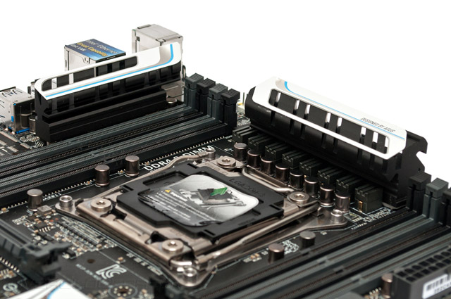За отвод тепла от силовых элементов узла электропитания отвечает небольшой охладитель, распложенный над процессорным гнездом, тогда как второй радиатор, находящийся между разъемами задней панели и слотами ОЗУ, играет сугубо декоративную роль и не участвует в отводе тепла. Миниатюрные габариты системы охлаждения дают повод усомниться в ее эффективности при серьезном разгоне, так что пользователям придется позаботиться об организации интенсивной вентиляции околосокетного пространства.